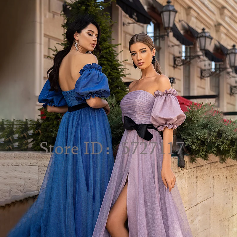Вечернее платье-трапеция без бретелек с пышными короткими рукавами и высоким разрезом, блестящие платья для выпускного вечера с поясом, официальное праздничное платье