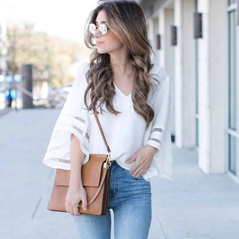 Женская шифоновая блузка с V-образным вырезом и расклешенными рукавами