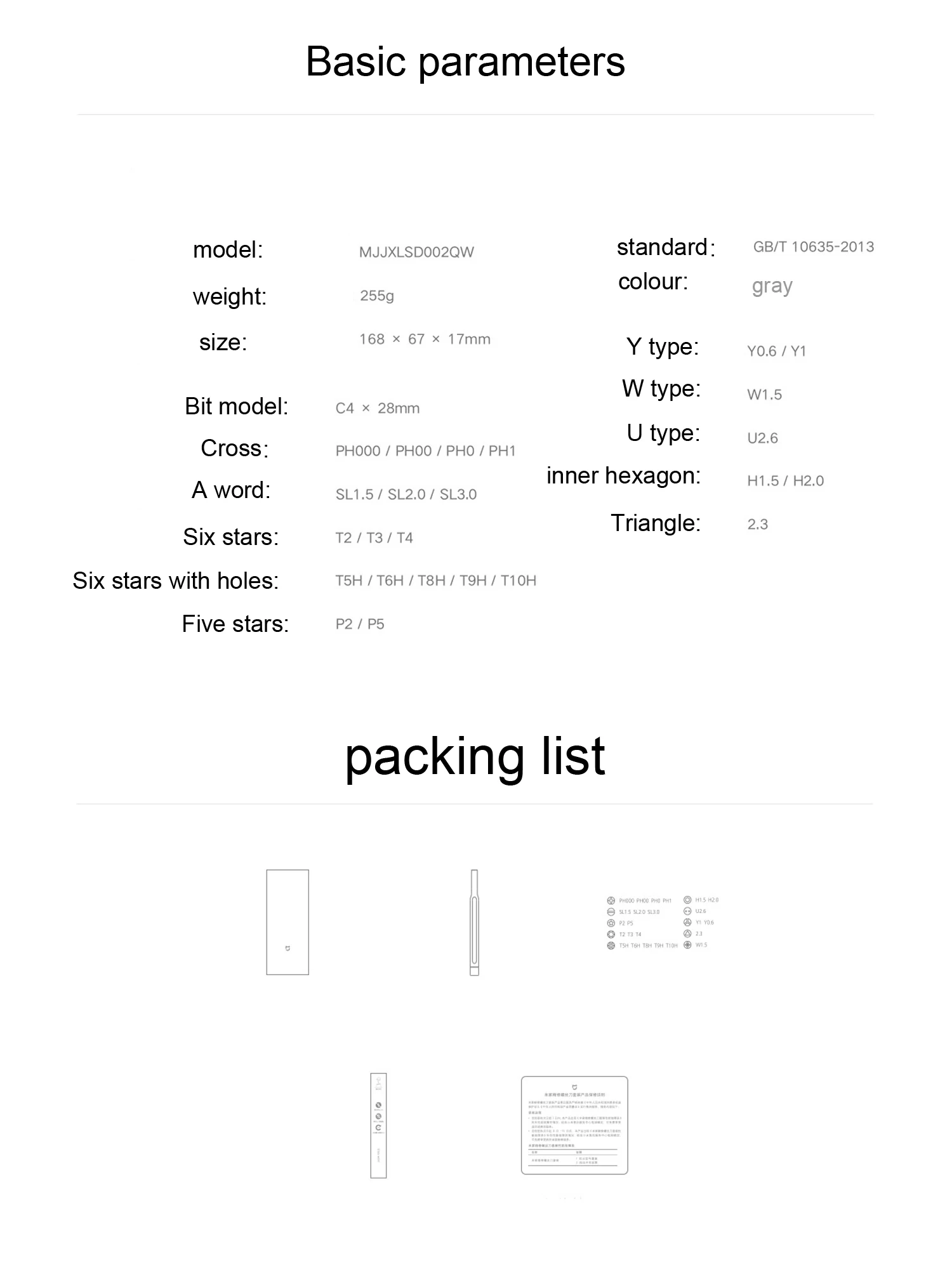 2. Биты: Phillips ( PH000 / PH00 / PH0 / PH1 ), Hex ( H1.5 / H2.0 ), Torx ( T2 / T3 / T4 / T5H / T6H / T8H/ T9H / T10H ), щелевой (1,5/1,5/2,0/3,0), гаечный ключ U2.6, три крыла 1,5, y-образный треугольник (Y1/Y0.6) Pozi ( P2 / P5 ), треугольник 2,3.
