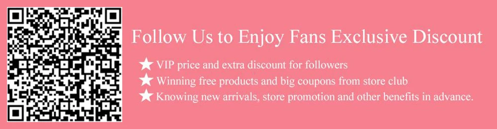 Следуйте за нами, чтобы насладиться эксклюзивной скидкой фанатов1.VIP Цена и дополнительная скидка для подписчиков2. Выигрышные бесплатные продукты и Большие Купоны от магазина club3. Зная Новые поступления, продвижение магазина и другие преимущества заранее.