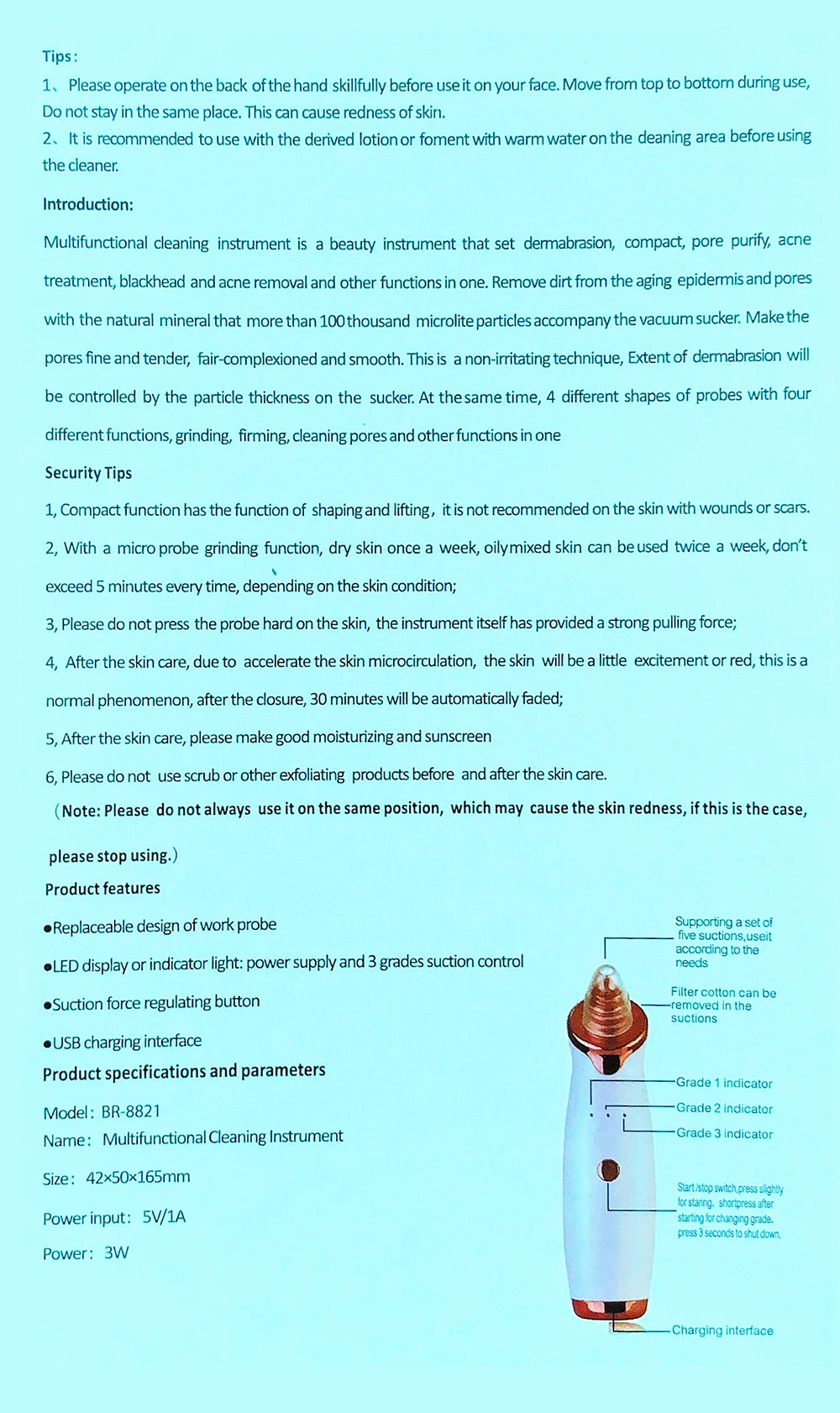 Функции продуктов:Может использоваться для удаления черных точек, акне и глубокой очистки лица, подходит для лечения сухой кожи, провисшей кожи, тусклой кожи, а также морщин, увеличивающих кровообращение в коже.Поставляется с 5 сменными красивыми головками, которые могут предложить различные функции и предложить более глубокое очищение для кожи лица. Множество уровней регулируемого всасывания делает его подходящим для другой кожи.Помогает удалить поры, угри, морщины на лице и сохранить вашу кожу чистой, делая кожу гладкой, чтобы быть омолаженнойОписание:Цвет: белый, розовое золотоМатериал: АБС-пластикФункция: удаление черных точек, сужение пор, уход за кожейСпособ зарядки: usb-кабельИнструкции:1. Нанесите горячее полотенце или черную головку на кожу лица, держите ее в течение 5-10 минут, откройте поры и смягчите кожу;2. Выберите необходимый вам наконечник и установите наконечник на Главный блок;3, медленно двигаясь по коже лица, пожалуйста, не оставайтесь в одном положении слишком долго, чтобы избежать кожи красного и фиолетового цвета;4. После очистки, постирайте холодной водой, нанесите маску, правильно Используйте смягчающие средства, увлажните лицоПримечания:1. Реальный цвет товара может быть s светильник ly отличаться от изображений, размещенных на веб-сайте, по причине многих факторов, таких как яркость вашего монитора и светильник яркость.2. Возможны незначительные отклонения в данных измерений.3. Спасибо за пониманиеУпаковочный лист:1 шт. * косметический инструмент1 шт. * USB кабель5 шт. * Сменная головка1 сумка * хлопок
