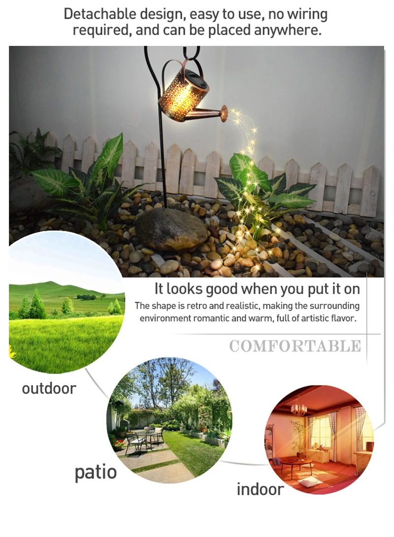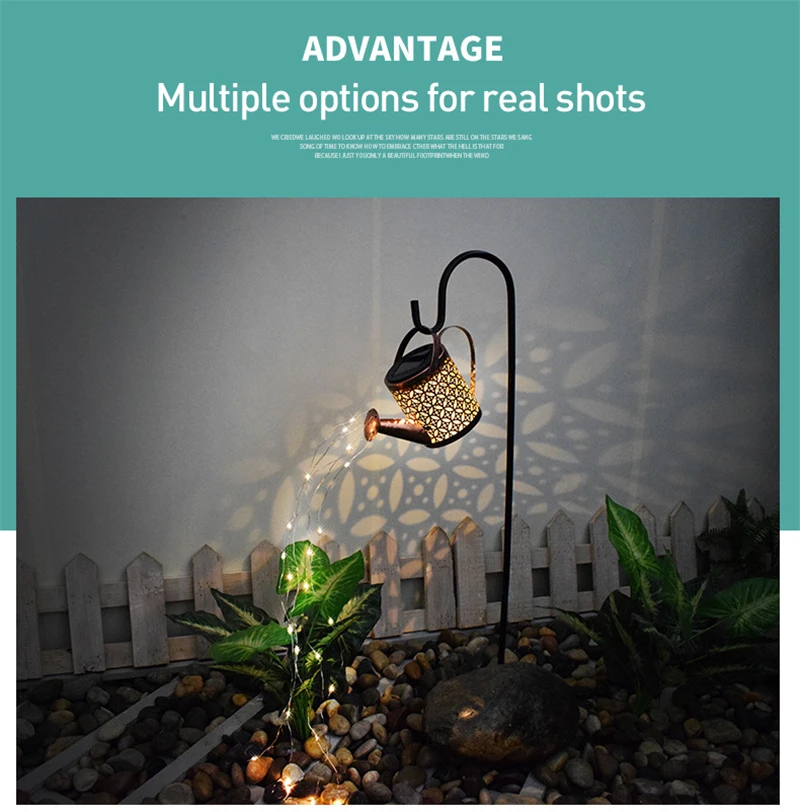1. Сочетание традиций и искусства: многие владельцы домов могут испытать только половину своего прекрасного сада из-за отсутствия некоторых художественных украшений. Солнечный садовый светильник чайника: светильник похож на водопад, добавляя красоту и атмосферу во внутренний двор, обеспечивая при этом необходимый светильник.