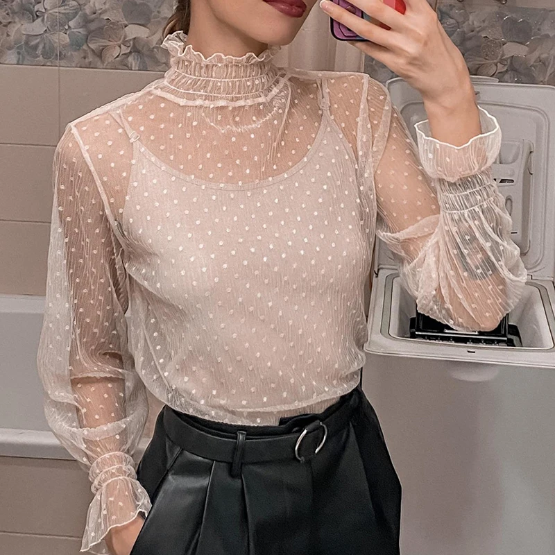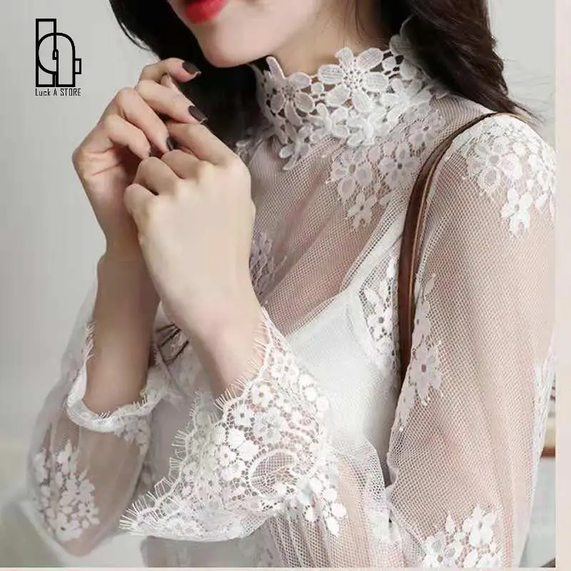 Женская кружевная блузка с длинным рукавом и высоким воротником