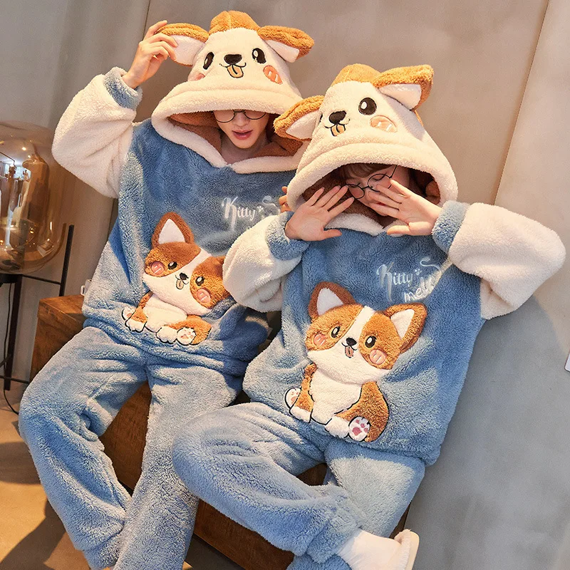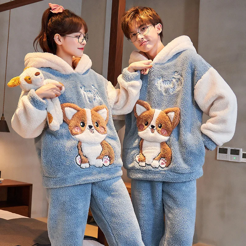 Зимние пижамные комплекты для пар, женская и Мужская Утепленная одежда для сна, пижама с рисунками животных, собаки, детской одежды, домашняя одежда, теплые толстовки