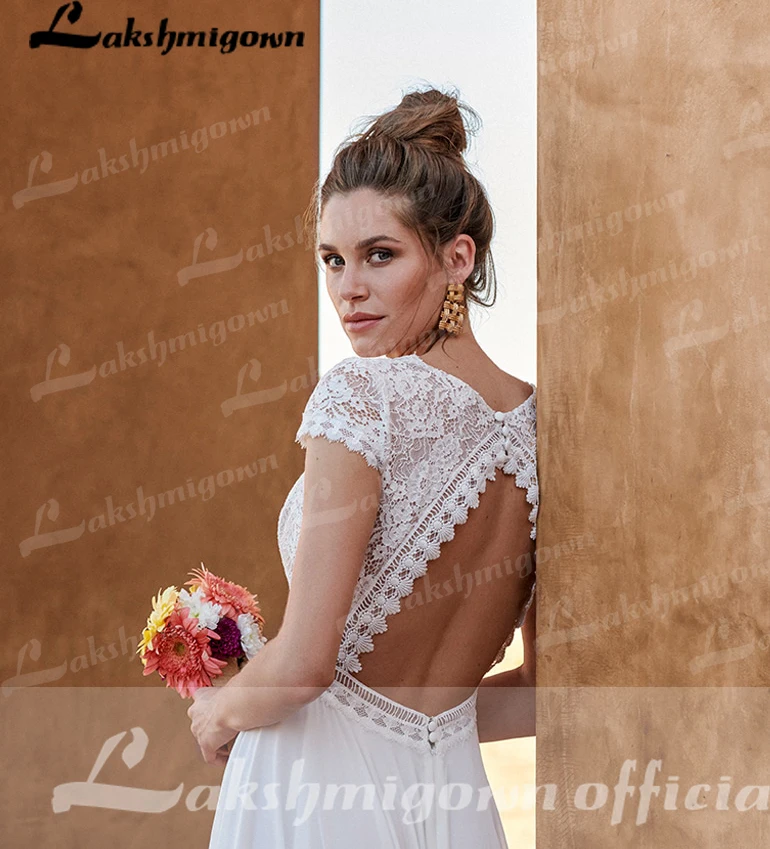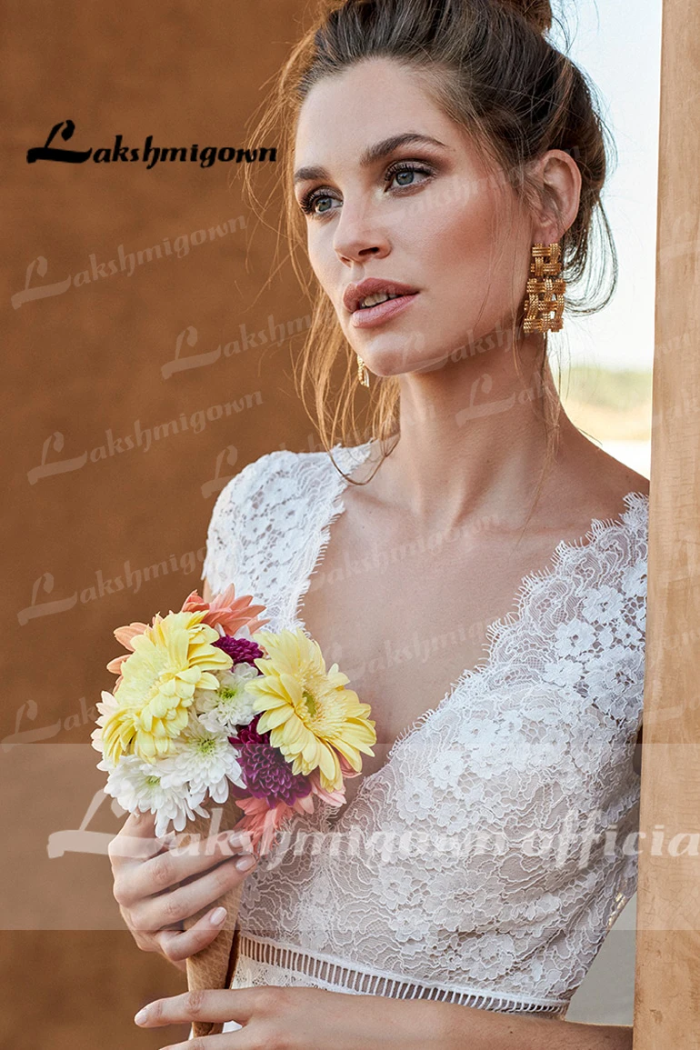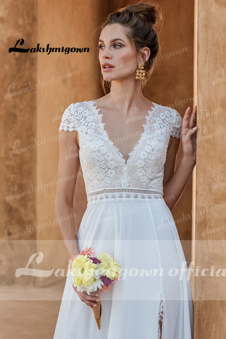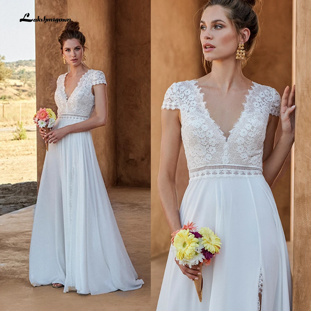 2022 пляжные свадебные платья в стиле бохо, кружевные очаровательные свадебные платья с разрезом спереди и шлейфом, соблазнительные Свадебные платья цвета слоновой кости с коротким рукавом