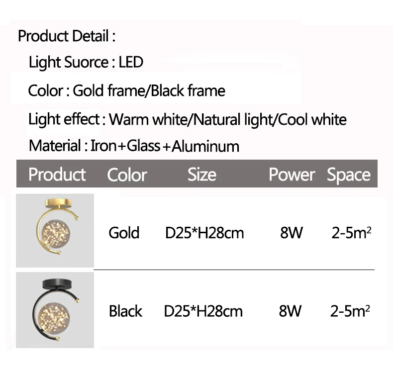 1. Название: современный светодиодный потолочный светильник2. Цвет корпуса: черная оправа, Золотая оправа3. Размер: d25 см, мощность: 8 Вт, площадь: 2-5 м24. Материал: металлический корпус лампы, стеклянный абажур5. Применение: гостиная, спальня, проход, коридор6. Стиль: простой светодиодный потолочный светильник7. Тип: домашние светильники для помещений8. Доставка из Китая9. Гарантия: один год10. Вход: AC 110V 220V