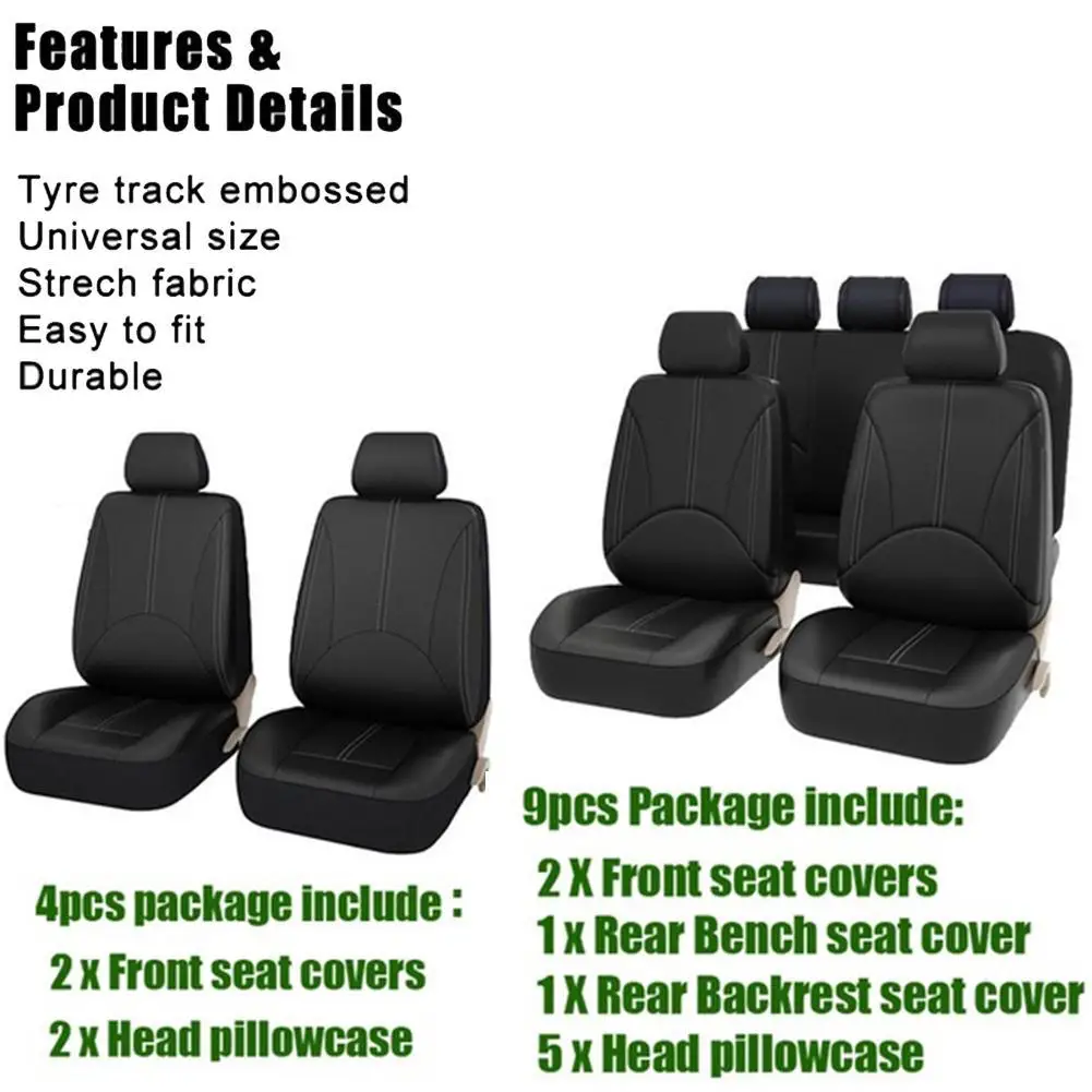 Характеристики:[1] Материал: из искусственной кожи[2] Цвет: черный[3] Этот чехол для сиденья подходит для большинства автомобильных сидений на рынке, вы можете использовать его в течение четырех сезонов. Не слишком жарко летом и не слишком холодно зимой.[4] высококачественный и дышащий материал с максимальной прочностью для длительного использования.[5] высококачественная ткань, дышащая, удобная, грязеотталкивающая, износостойкая, легко моется, не отпадает.[6] и это не только защитный чехол, но также может использоваться для украшения интерьера автомобиля, это сделает ваш автомобиль новым внешним видом.[7] Чехлы для автомобильных сидений мгновенно трансформируют ваш интерьер, покрывая поврежденные сиденья, а поверхность из водонепроницаемой гладкой кожи защищает сиденья от брызг, пятен, выцветания и грязи. Отличный выбор для большинства автомобилей.[8] легко установить и будет надежно закреплен на месте с длительным сроком службы. Отсоедините, моющиеся и многоразовые.4 шт. посылка включает в себя:2 x чехол для переднего сиденьяНаволочка на голову-2 шт.9 шт. посылка включает в себя:5 x отдельный чехол для подголовника2 x чехол для переднего сиденья1 чехол для заднего сиденья1 чехол для заднего сиденьяПримечание:Пожалуйста, поймите, что светильник отличается от облучения или экрана компьютера, поэтому я не могу гарантировать, что фотографии и реальный цвет на 100% совпадают.