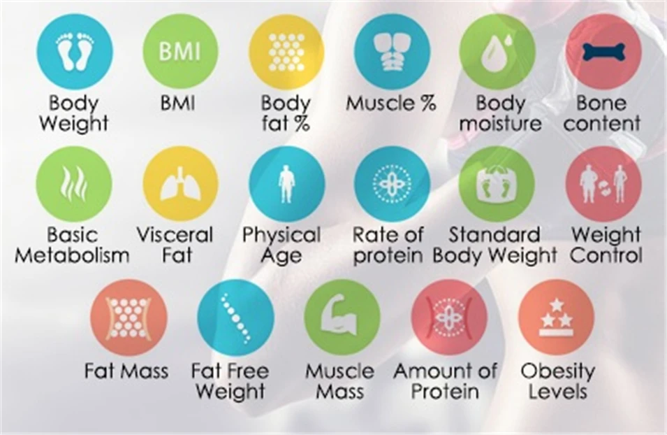 Может анализировать 25 данных тела (с помощью учета приложений), включая 25 основных данных о состоянии здоровья(ИМТ, тип тела, индекс ожирения, вес тела, процент жира, костная масса, базальный метаболизм, вода, скорость мышц, вязкий жир, мышечный вес, белок, обезжиренный вес, возраст тела, содержание воды, вес жира, оценка тела)