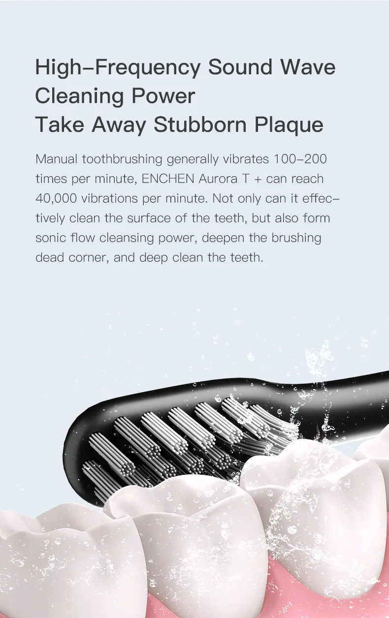 Упрямый налетРучная зубная щетка обычно вибрирует 100-200 раз в минуту, ENCHEN Aurora T + может достигать 40000 вибраций в минуту. Он не только эффективно очищает поверхность зубов, но и формирует звуковой поток очищающей мощности, углубляет чистящий мертвый уголок и глубоко очищает зубы.