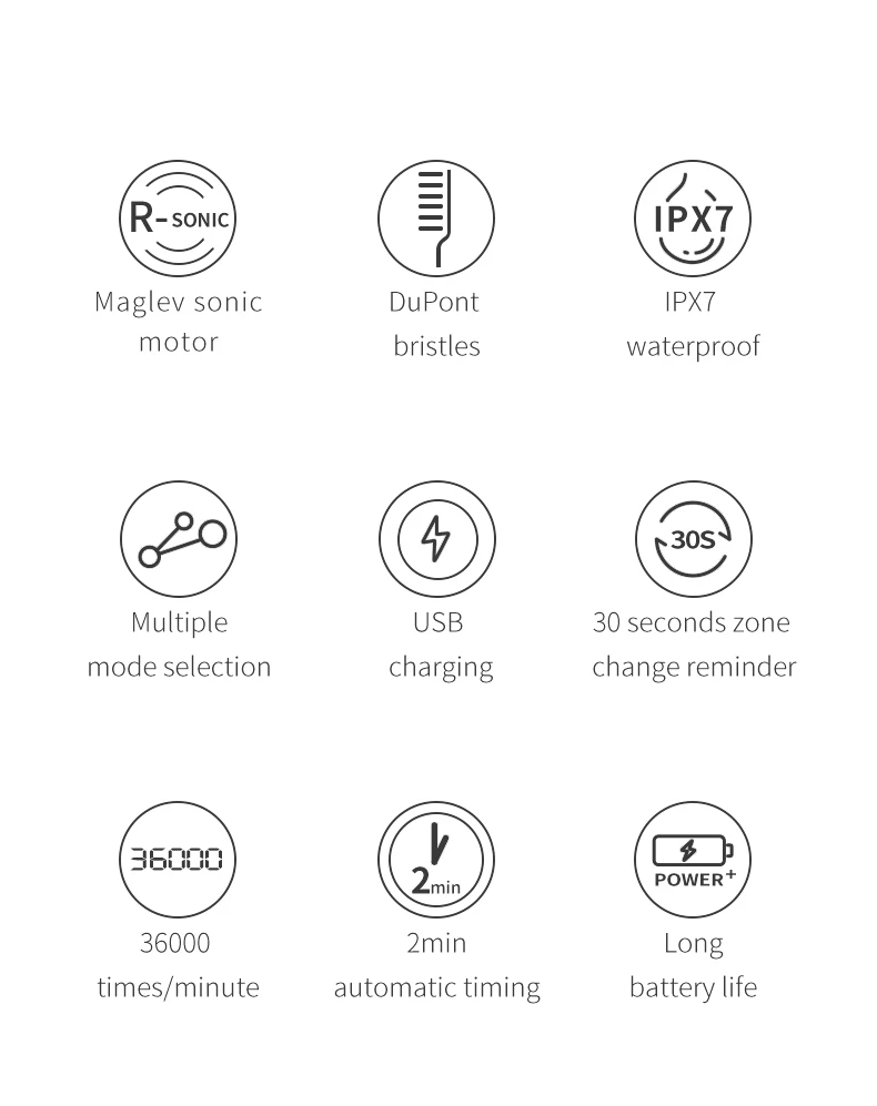 ● Звуковой двигатель Maglev● Щетинки DuPont● Водонепроницаемый IPX7● Выбор нескольких режимов● Usb-зарядка● Напоминание об изменении зоны на 30 секунд● 36000 раз/минуту● Автоматическая синхронизация 2 мин● Длительный срок службы батареи