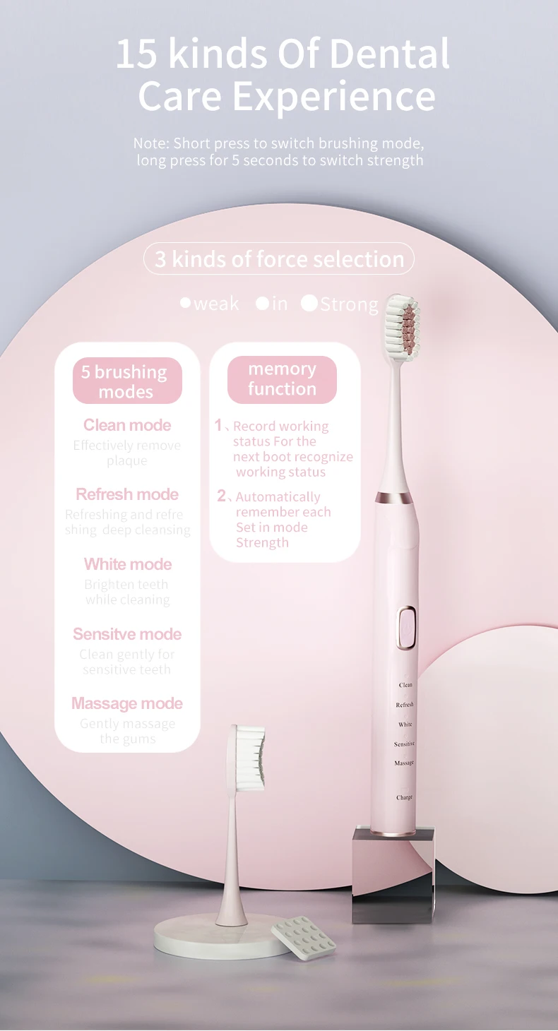 5 режимов чистки:● Режим очистки: эффективно удаляетНалет● Режим обновления: освежающий глубокийОчищение● Белый режим: осветляет зубыВо время чистки● Сенсационный режим: Аккуратно очиститеЧувствительные зубы● Режим массажа: деликатный массажДесныФункция памяти:● Запись рабочего состояния. Рабочее состояние по умолчаниюДля следующей загрузки.● Автоматическое запоминание набора силы в каждом режиме.3 варианта прочности:Неделя, средний, сильный