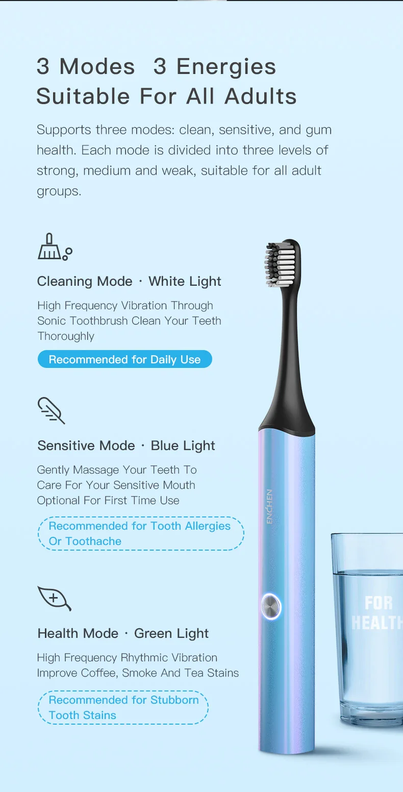 Ультразвуковая зубная щетка с магнитной подвеской обеспечивает эффект очистки от высокочастотной вибрации. Частота вибрации начального уровня продукции на рынке индуктивно-обычно составляет 10000-20000 раз/мин, который находится далеко от высокой частоты вибрации. ENCHEN Aurora T + вибрирует с частотой ≥ 40000 в минуту/минуту. Высокая частота 40000 имеет более быстрые и лучшие результаты очистки.● Двигатель магнитной левитации● ≈ 40000 раз/мин● Высокочастотная вибрация● 3 режима очистки● Выносливость в течение 14 дней● Водонепроницаемый IPX7● Сертифицированные FDA щетинки Dupont