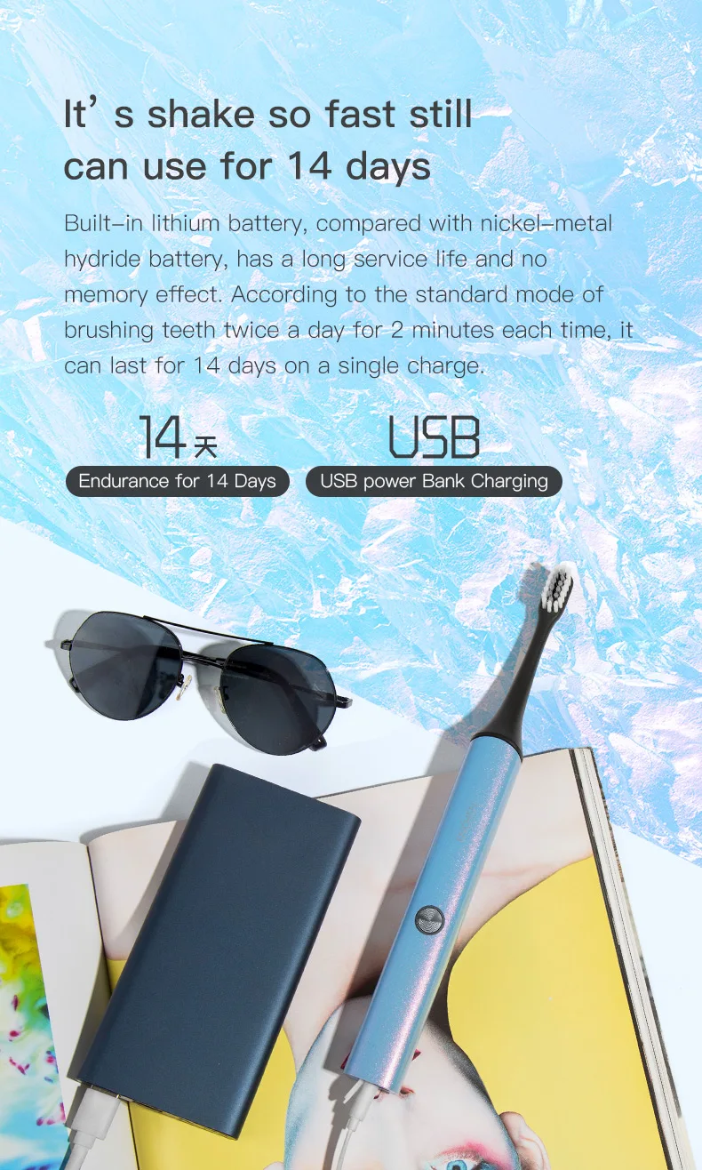 Встроенный литиевый аккумулятор, по сравнению с никель-металлическим гидридным аккумулятором, имеет длительный срок службы и Отсутствие эффекта памяти. В соответствии со стандартным режимом чистки зубов два раза в день в течение 2 минут каждый раз, он может длиться 14 дней при одной зарядке.● Выносливость в течение 14 дней● Зарядное устройство USB