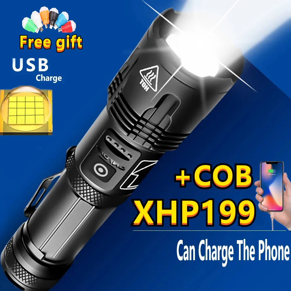 Новейший светодиодный супер яркий фонарик XHP199 с COB матрицей, USB Перезаряжаемый фонарь онарик XHP70.2 XHP50 с зумом, фонарик с батареей 5000 мАч, 18650, 26650