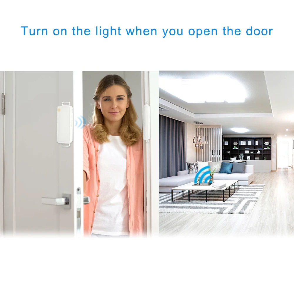 Работает с другими устройствами в вашем приложении Smart Life.Установите умную сцену в приложении, например, когда дверь открывается, устройство включено или выключено, когда дверь закрыта, устройство включено или выключено.