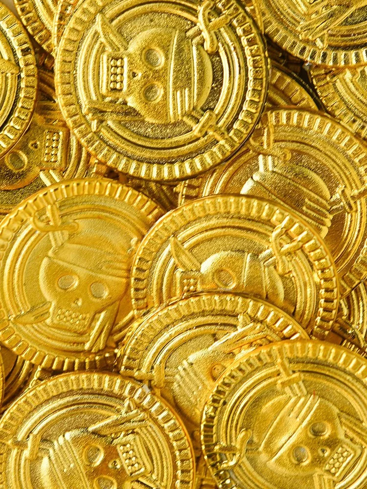 Новые золотые монеты, пиратское сокровище, игра на Хэллоуин, деньги...