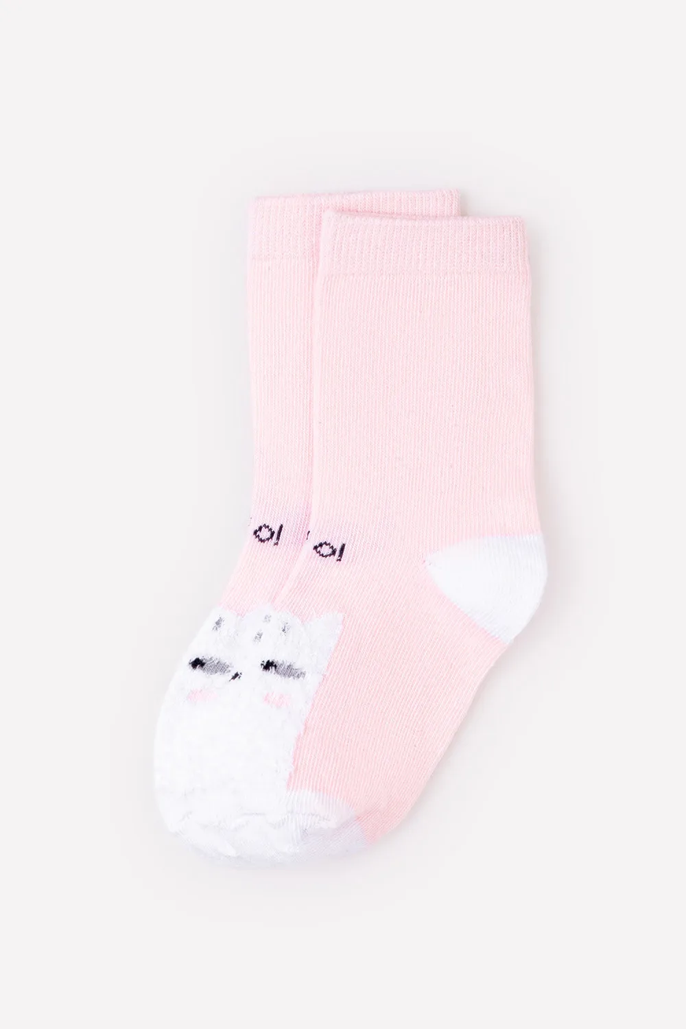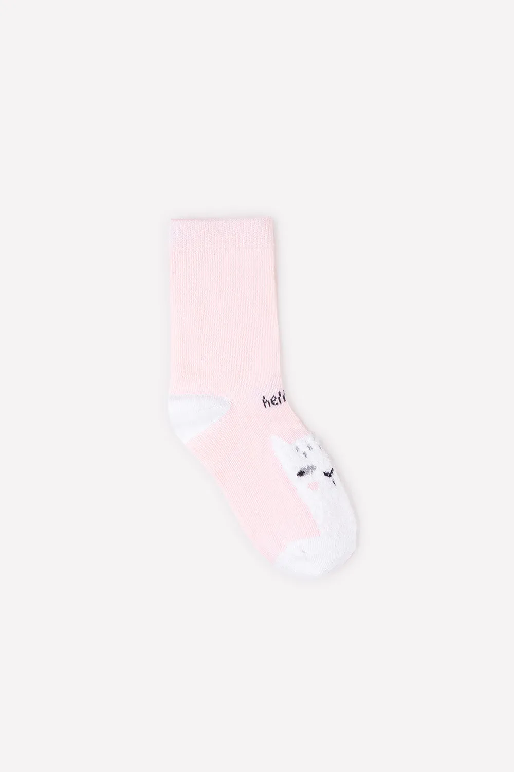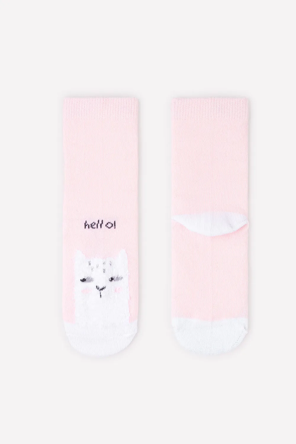 Описание: Розовые носки с белыми носком и пяткой и эластичной резинкой. Украшены изображением кота из белой пушистой пряжи и надписью "Hello!" Благодаря нейлону и эластану лучше облегают детскую ножку и дольше сохраняют опрятный внешний вид.