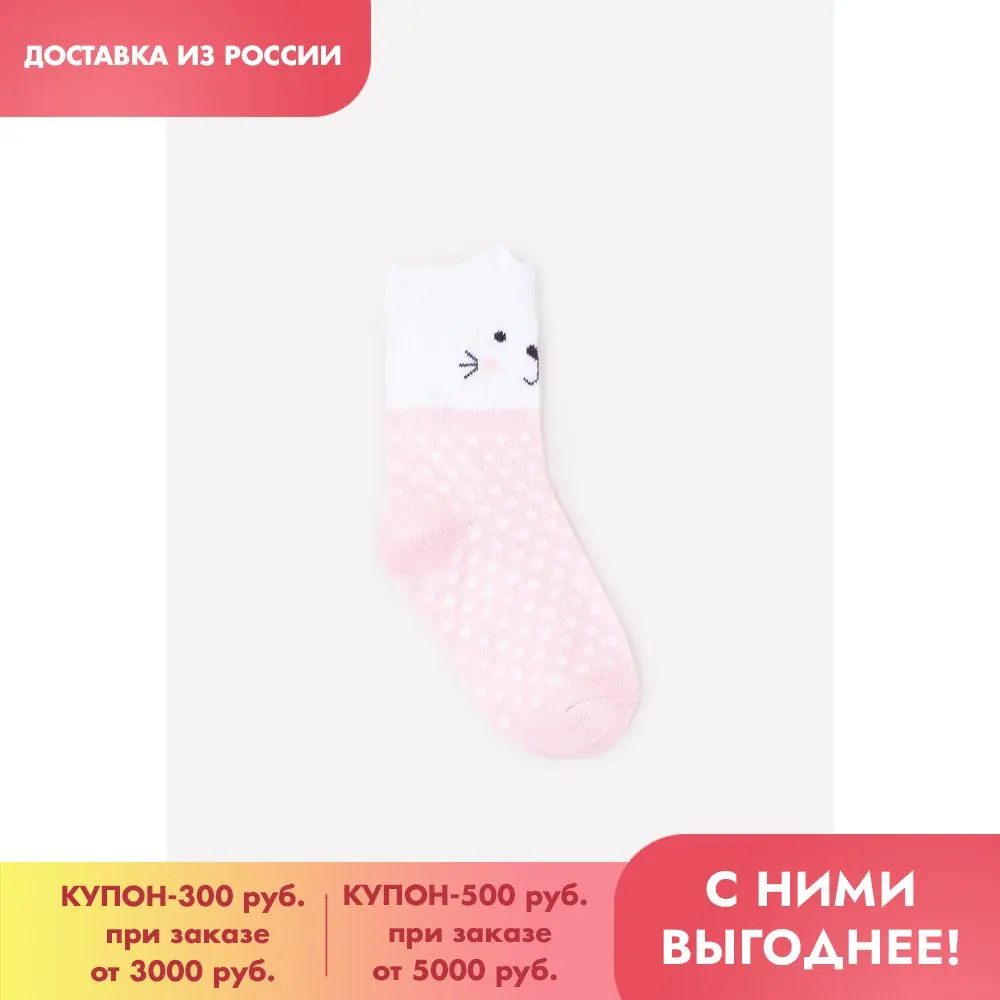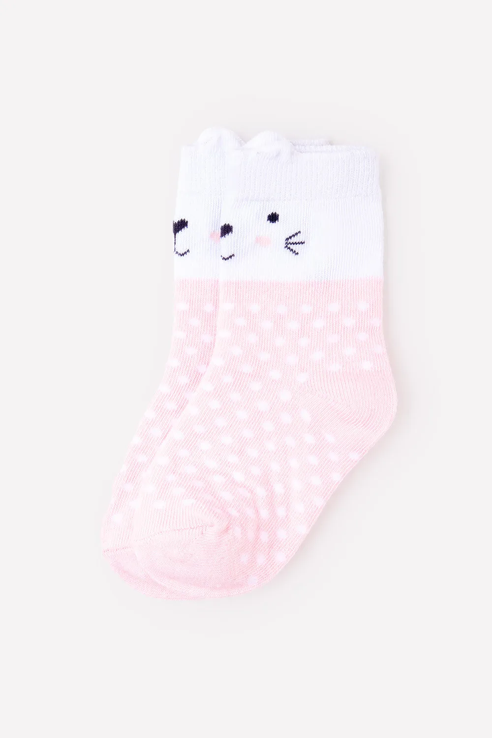 Описание: Бело-розовые носки с эластичной резинкой. Украшены белыми горошками и изображением звериной мордочки. Над резинкой - объёмные ушки. Благодаря нейлону и эластану лучше облегают детскую ножку и дольше сохраняют опрятный внешний вид.
