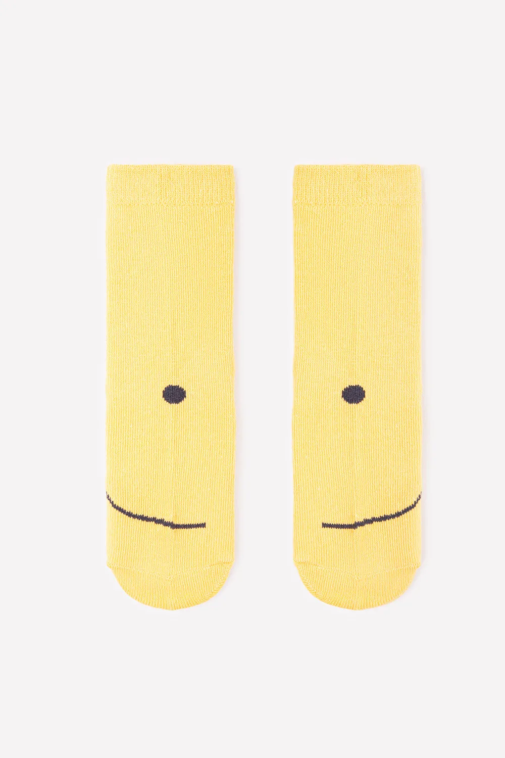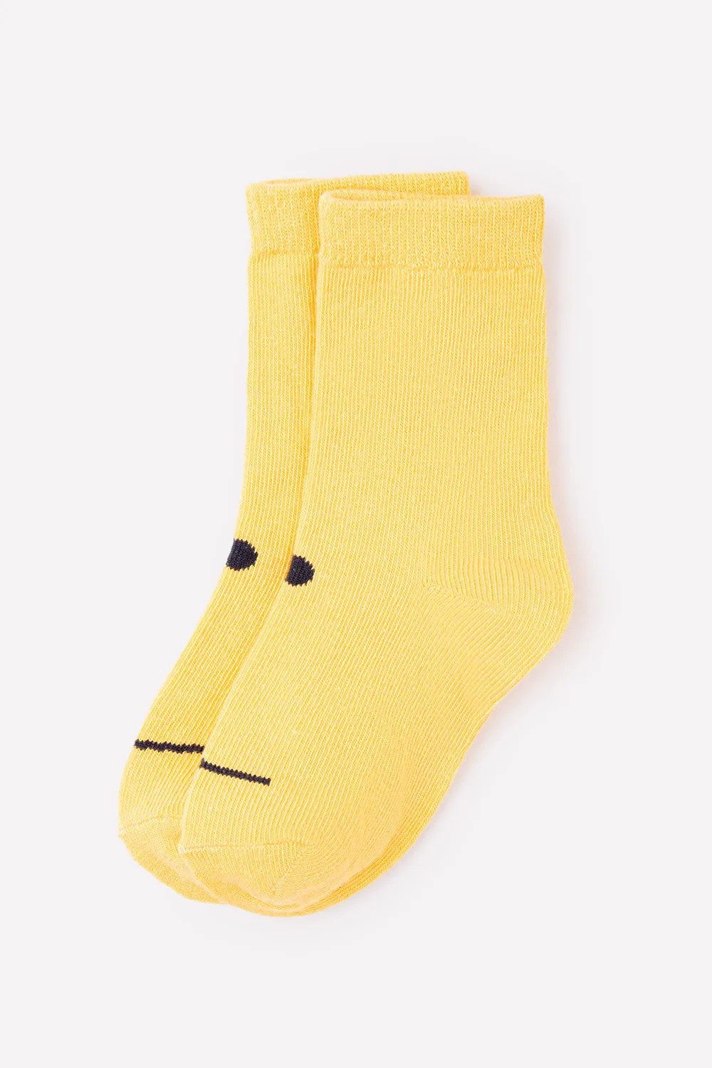 Описание: Однотонные жёлтые носки с эластичной резинкой. Украшены изображением смайлика. Благодаря нейлону и эластану лучше облегают детскую ножку и дольше сохраняют опрятный внешний вид.