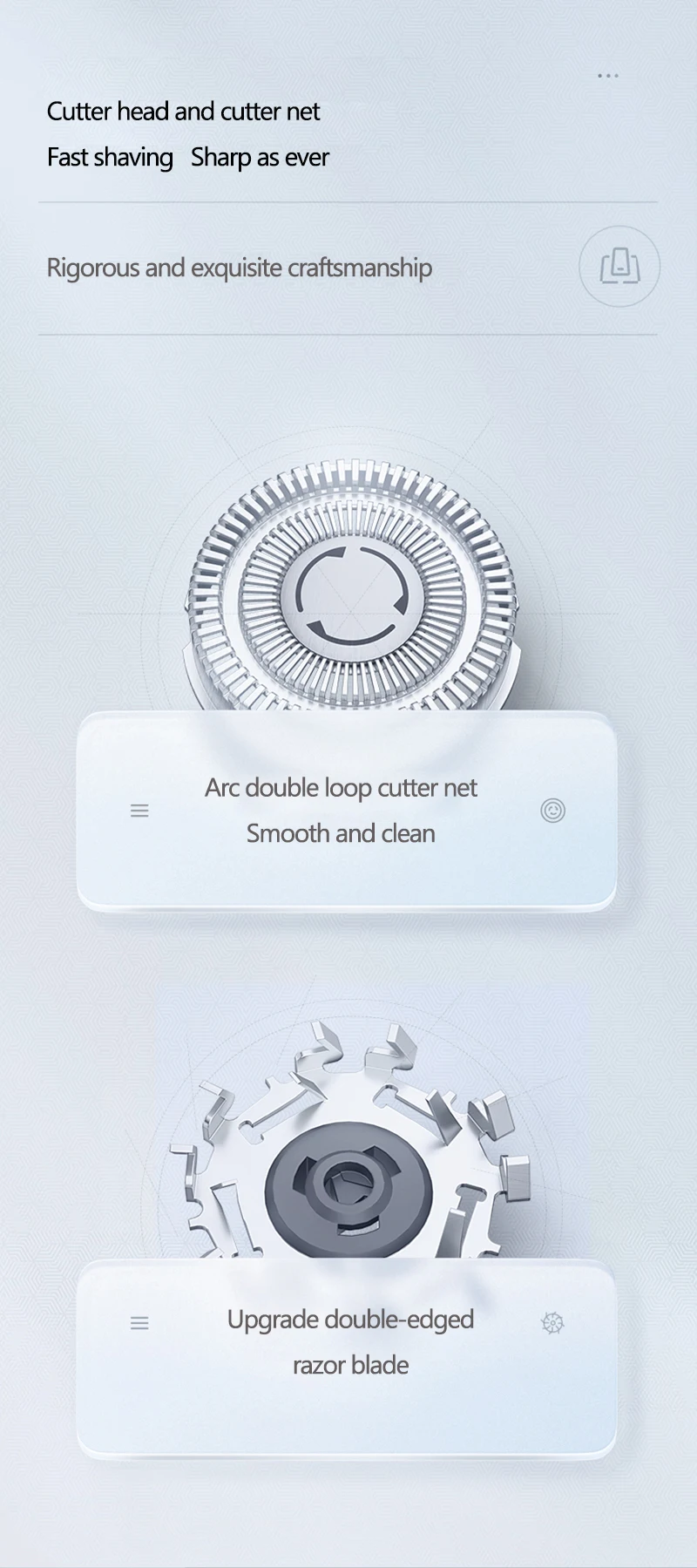 Вся режущая головка спроектирована с полностью плавающей структурой, а 3 головки резака разработаны с независимой плавающей во всех направлениях. Направленный на замысловатый рост усов, гладкий шпон, быстрое бритье, отсутствие остатков.