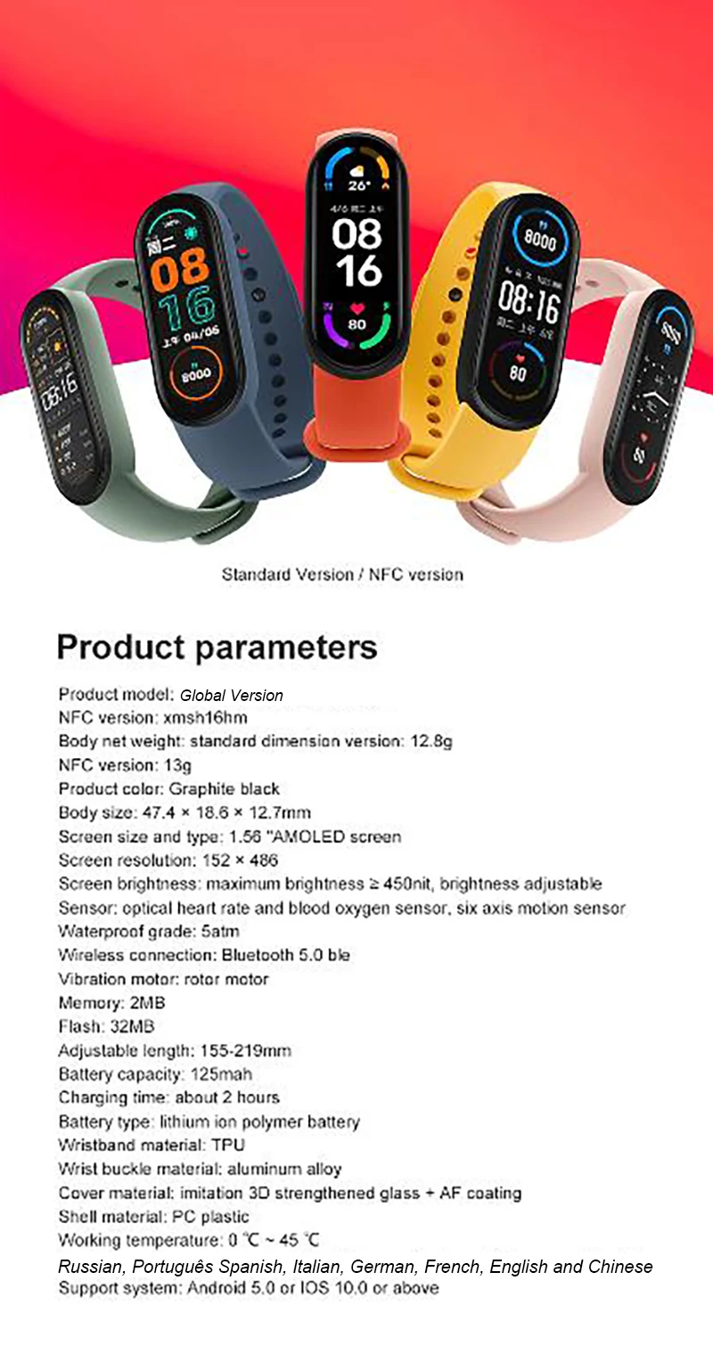 Посылка:Mi smart band 6 Body * 1, ремешок на запястье * 1, Магнитный зарядный кабель * 1, руководство пользователя * 1