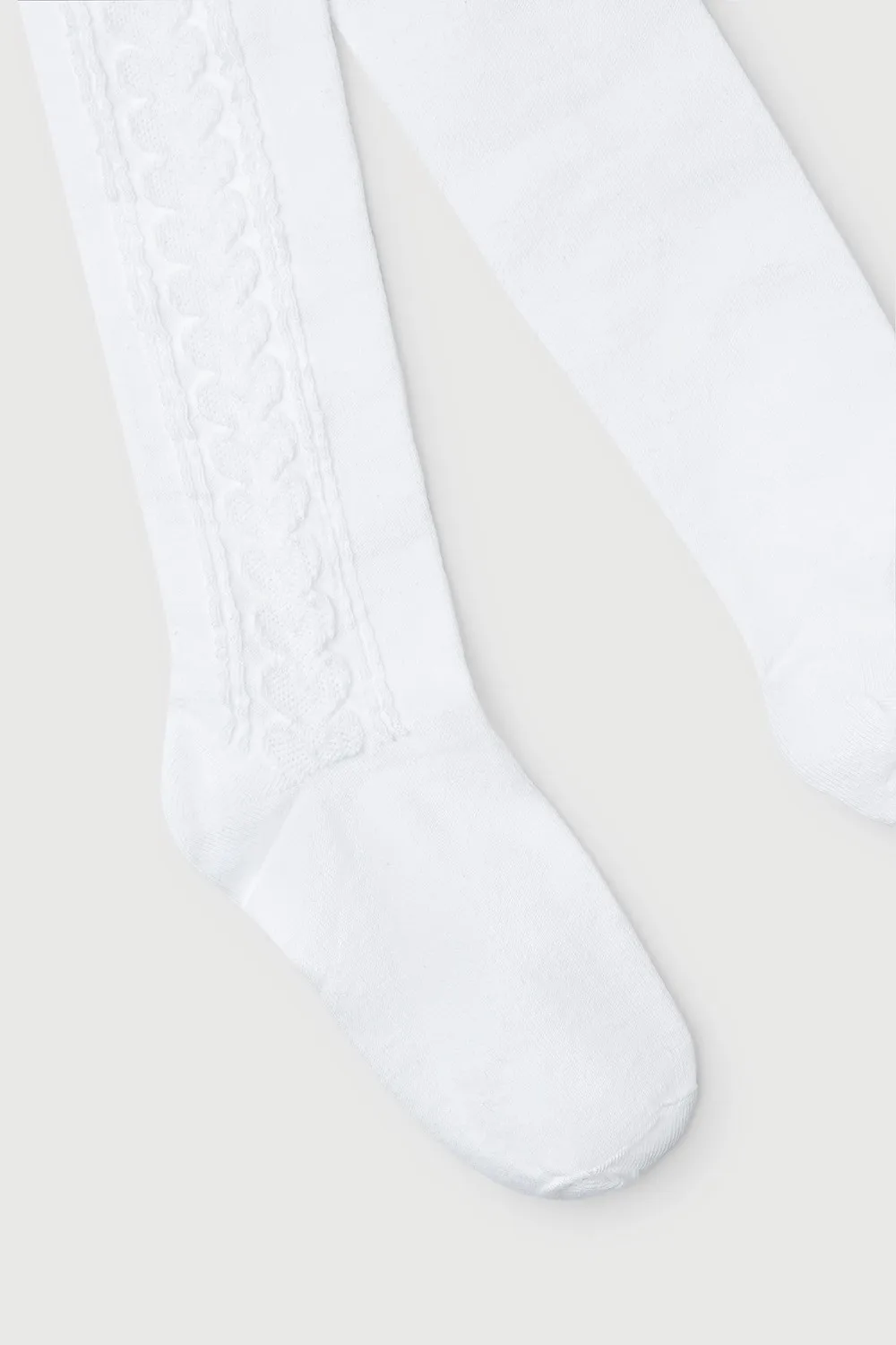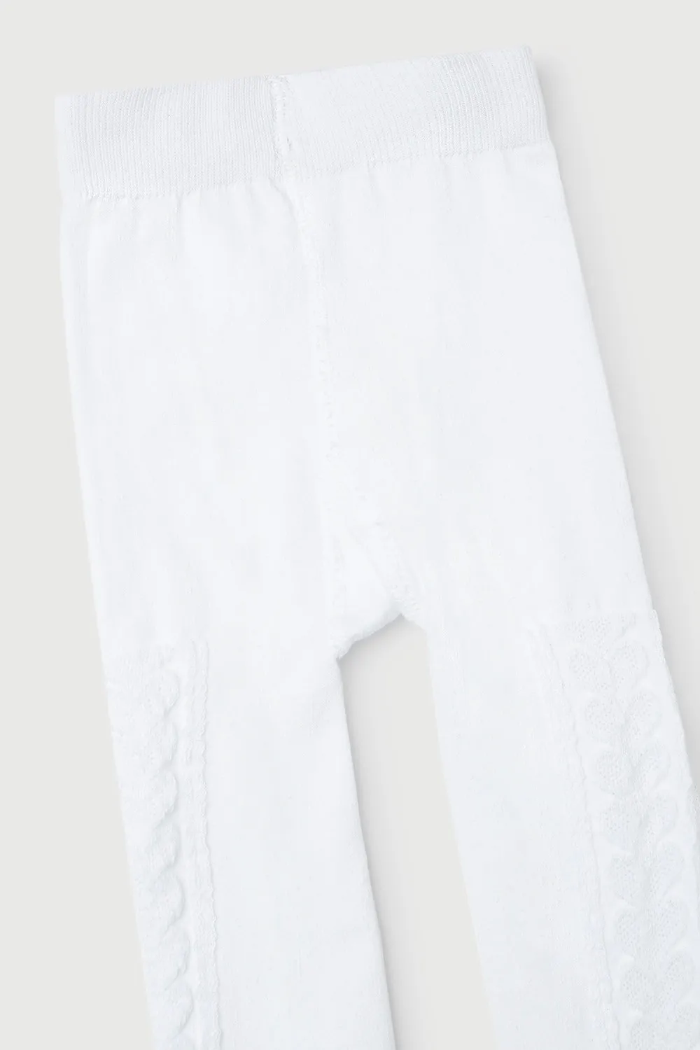 Описание: Однотонные колготки для девочки белого цвета с эластичной резинкой в поясе и ажурным узором в виде сердечек по бокам.