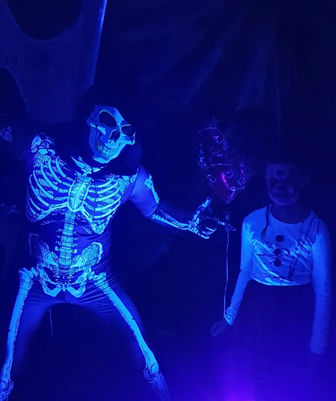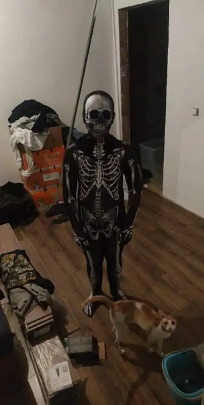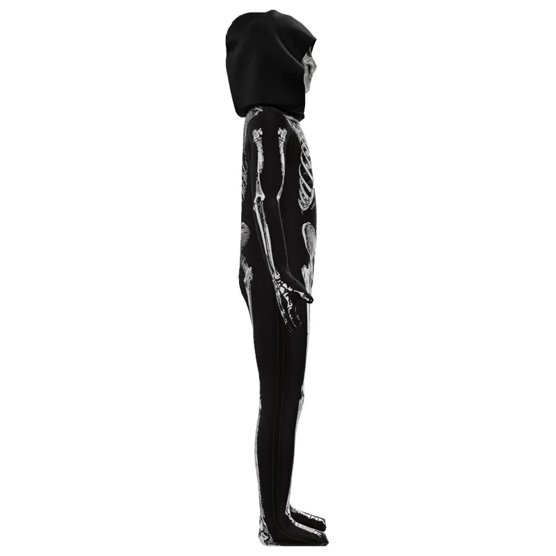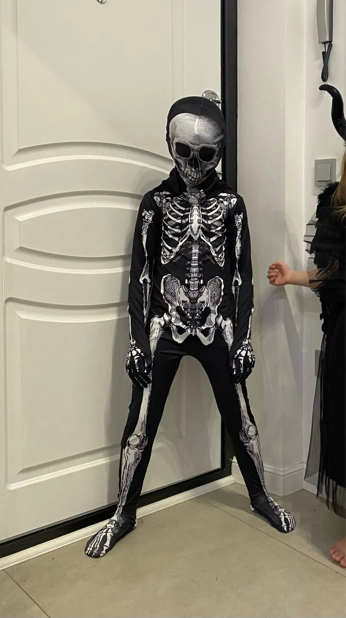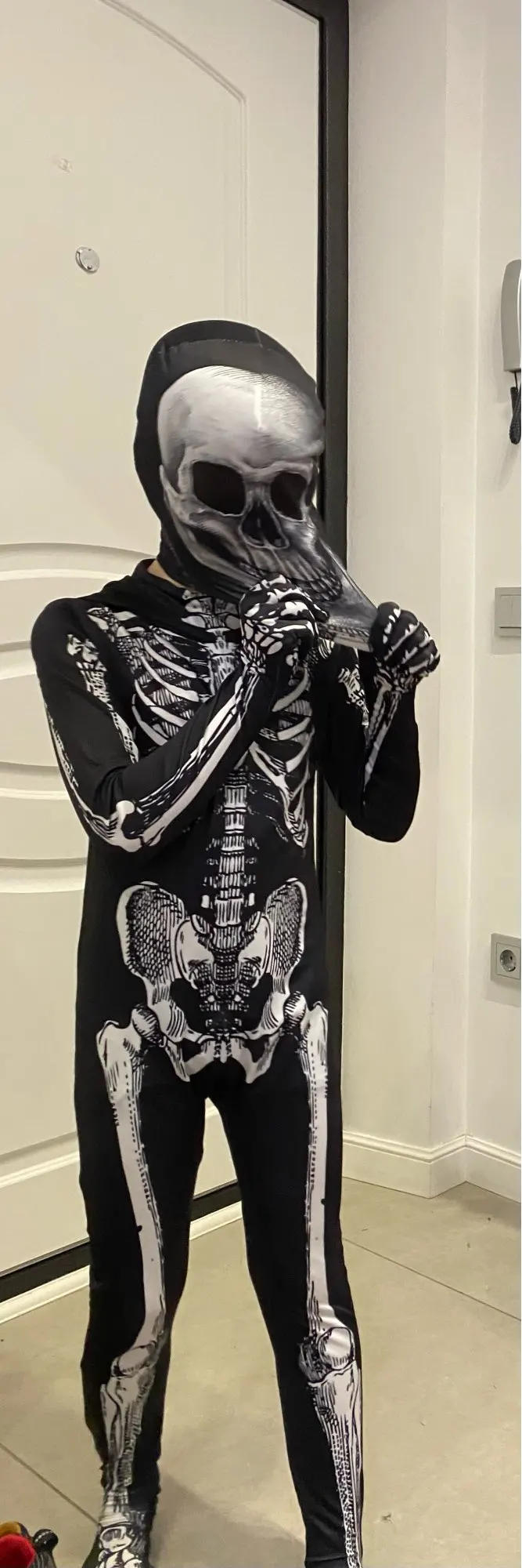 Костюм крутой! Страшный, особенно, когда надета верхняя часть - череп. У черепа, где глаза, вшита дырчатая ткань - со стороны не видно, а тому, на кого надет, хорошо видно все. Комбез с руками и ногами, спереди скрытая молния. Цвет насыщенный. Размер брала 125-135см. Реально он 130 - на костюме написано. Ребенку стройному ростом 128 как раз, пальцы только чуть-чуть длинноваты. Возможно он и на 135 натянется, если сомневаетесь в размере, лучше взять больше. Товар пришел на 10 дней раньше срока