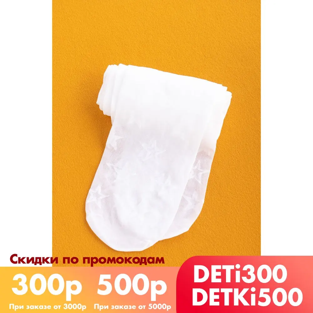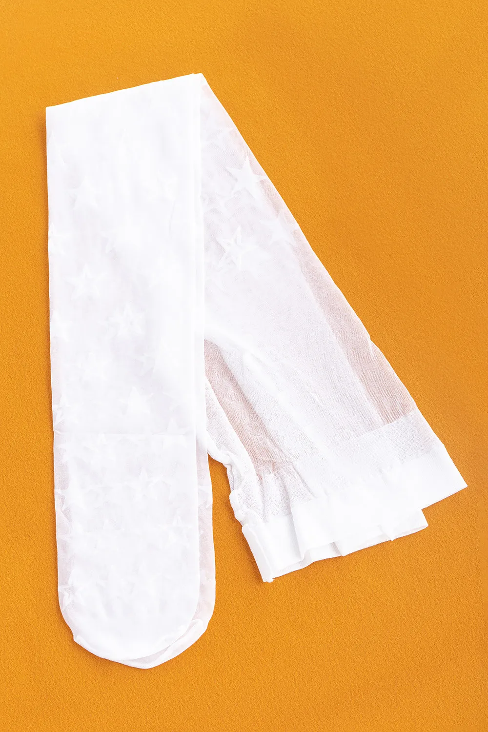 Описание: Нарядные колготы для девочки белого цвета с эластичной резинкой и усиленным мыском. Украшены ажурным рисунком со звёздами.