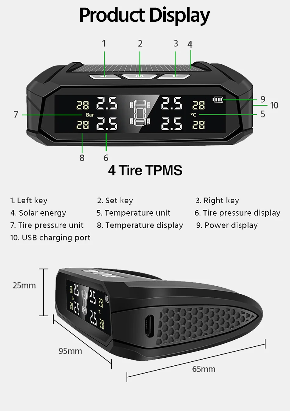 -Солнечная энергия + USB зарядка, не нужно заряжать путем подключения автомобильного прикуривателя;-Красочный ЖК-цифровой дисплей, четкий, чтобы показать информацию о шинах;-Задний контроль давления и температуры 4 шин;-Низкое давление воздуха/высокая температура сигнализации;-Высокая температура/Утечка/Низкий уровень заряда батареи;-Интеллектуальная ударная загрузка при движении автомобиля, не нужно включать/выключать;-Беспроводное подключение датчиками, простая установка;-Внутренние датчики и внешние датчики, удовлетворяют все ваши потребности;-Два блока (PSI / Bar) сменные, вы можете установить тот, который вам нравится.