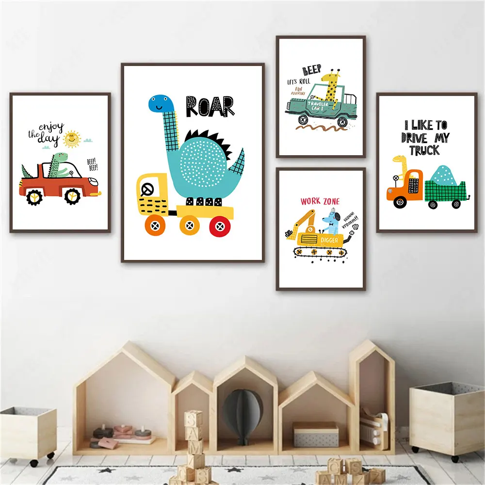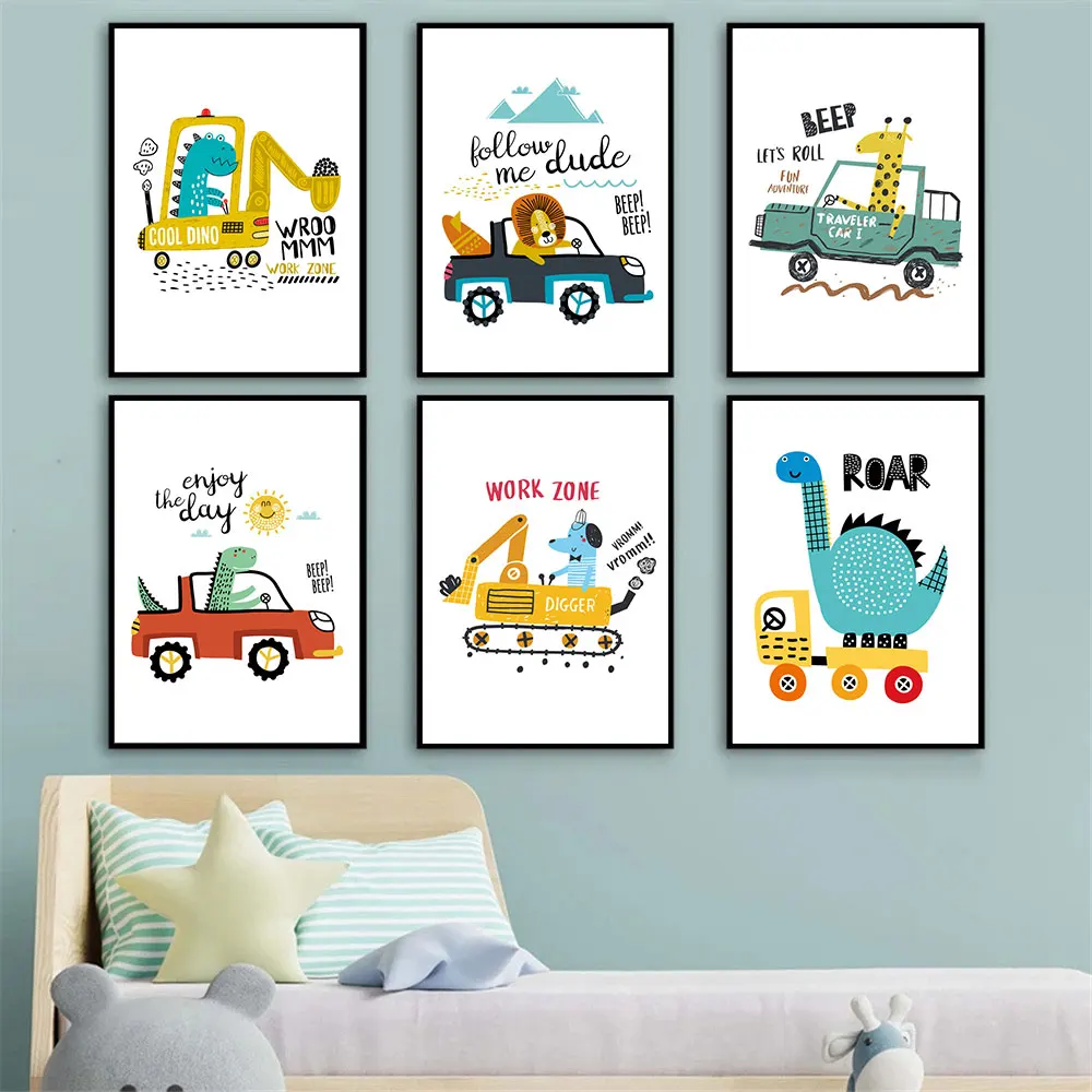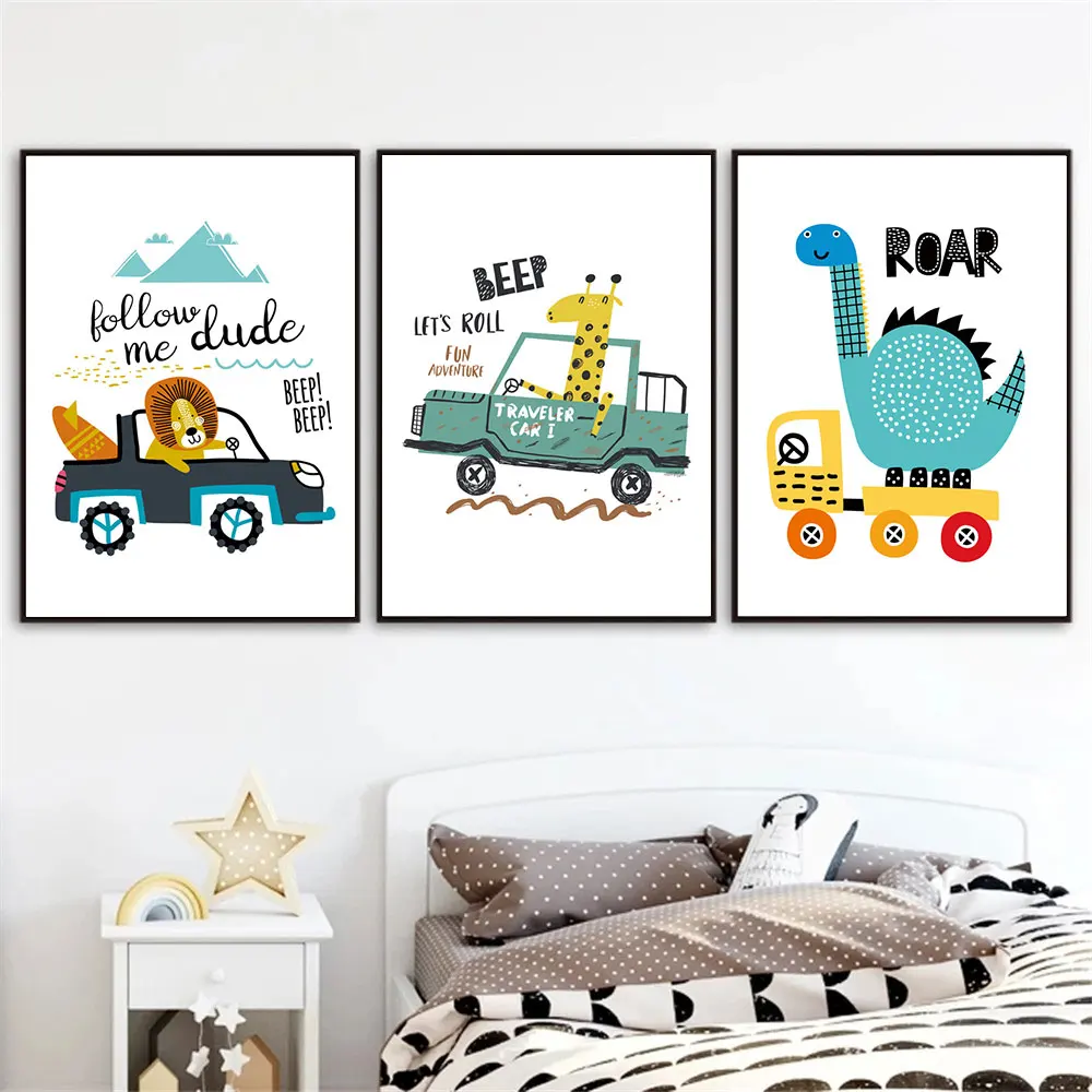 Картина на холсте водитель Лев динозавр Жираф игрушечный автомобиль художественный плакат детская Настенная картина в скандинавском стиле Декор для комнаты мальчиков