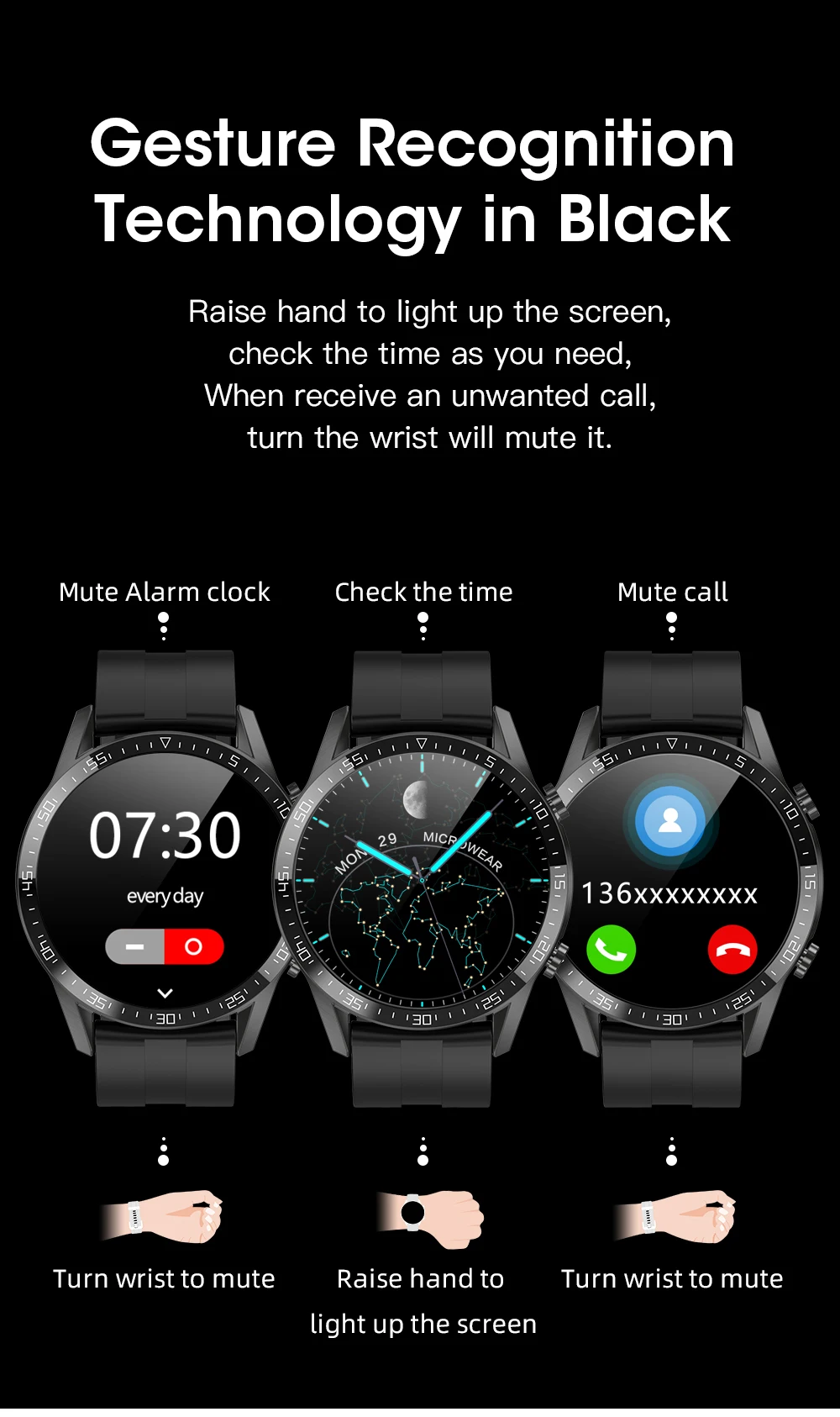 Технология в черномПоднимите руку светильник ить экран,Проверьте время, которое вам нужно,При получении нежелательного звонка,Поверните запястье и отключите его.