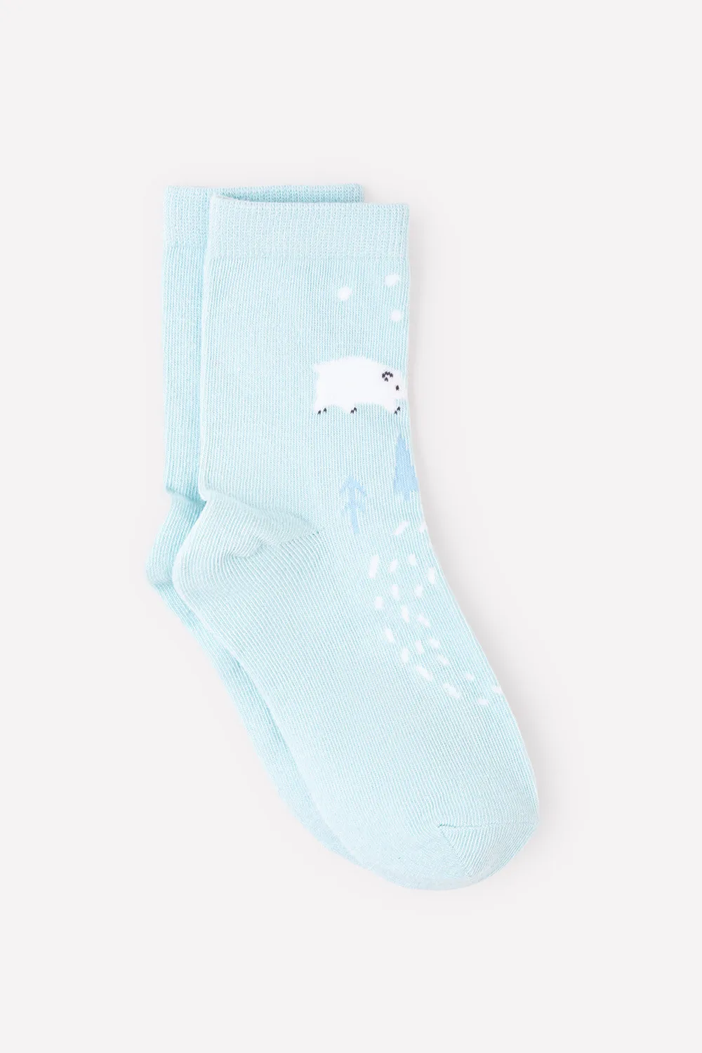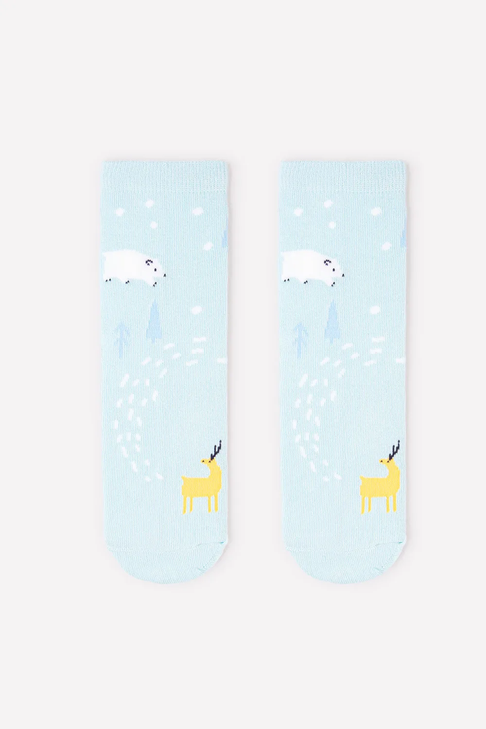 Описание: Голубые носки с эластичной резинкой. Украшены снежками и изображениями лесного оленя и белого мишки. Благодаря нейлону и эластану лучше облегают детскую ножку и дольше сохраняют опрятный внешний вид.
