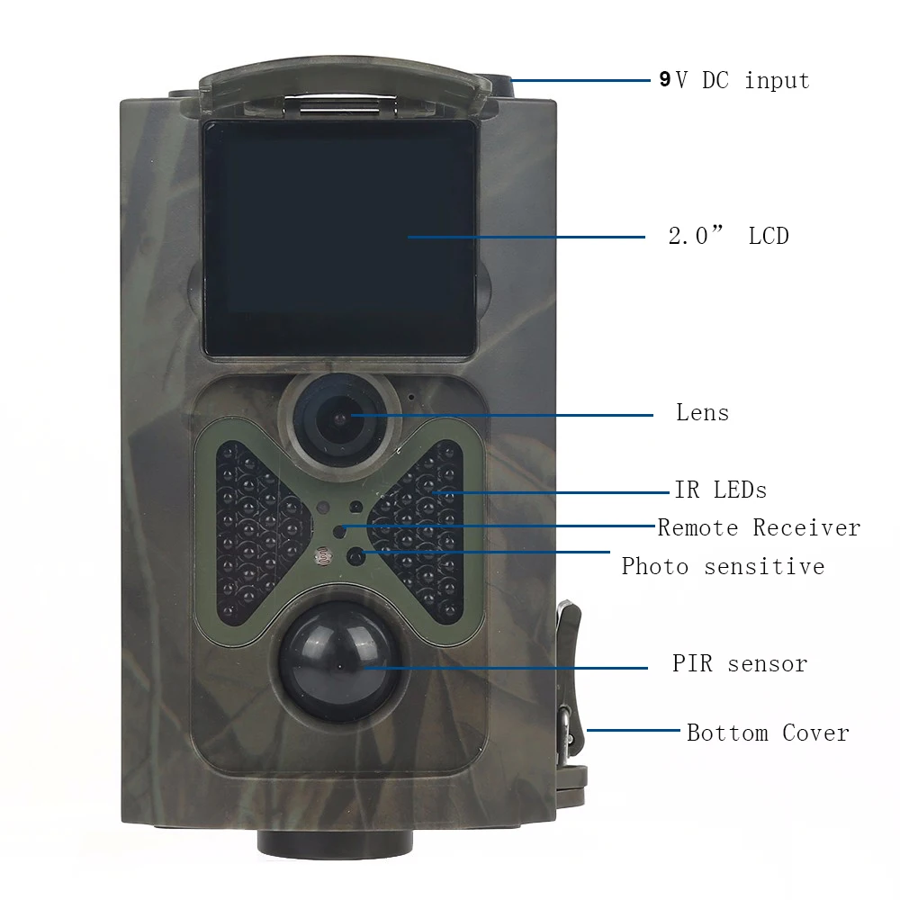 1. Захват 1080p фотографий и видео + аудио. Временные интервалы, целевая запись и режимы серии фото позволяют настроить камеру, чтобы быть идеальным инструментом наблюдения для дома, работы или следа.2. Захват предметов быстро после обнаружения движения в пределах 120 градусов обнаружения фронтальных и боковых PIR датчиков.3. Проверьте свои снимки мгновенно со встроенным жк-экраном, позволяя вам перемещаться по фотографиям и видео.4. Высокое качество изображения (5 мегапикселей CMOS Чип, съемка изображения 4000 × 3000 пикселей, также может снимать 3200 × 2400 изображения, и один триггер, Опциональная съемка 1-9).5. Быстрый запуск отклика (от найти цель снимать, промежуток времени составляет менее 0,5 секунд)6. Длительная продолжительность работы в режиме ожидания (ток в режиме ожидания меньше 0,2 мА, время работы в режиме ожидания составляет от 2 недель при нормальной температуре С перезаряжаемая литиевая батарея).7. Можно снимать видео (видео 1440*1080 пикселей; Видео 960*720 пикселей 30 кадров/сек; Длина видео 10 секунд-90 секунд опционально)8. Легкий и компактный размер, хорошо скрывает.9. Используйте карту памяти для записи, максимальная поддержка 32G (не входит в комплект).10. Автоматическая съемка и экспертиза по другим особым случаям.11. Ночная съемка без вспышки (без вспышки, ночная съемка со встроенным инфракрасным светодиодный светильник, низкая вспышка при съемке, не легко разоблачить, не легко потерять).