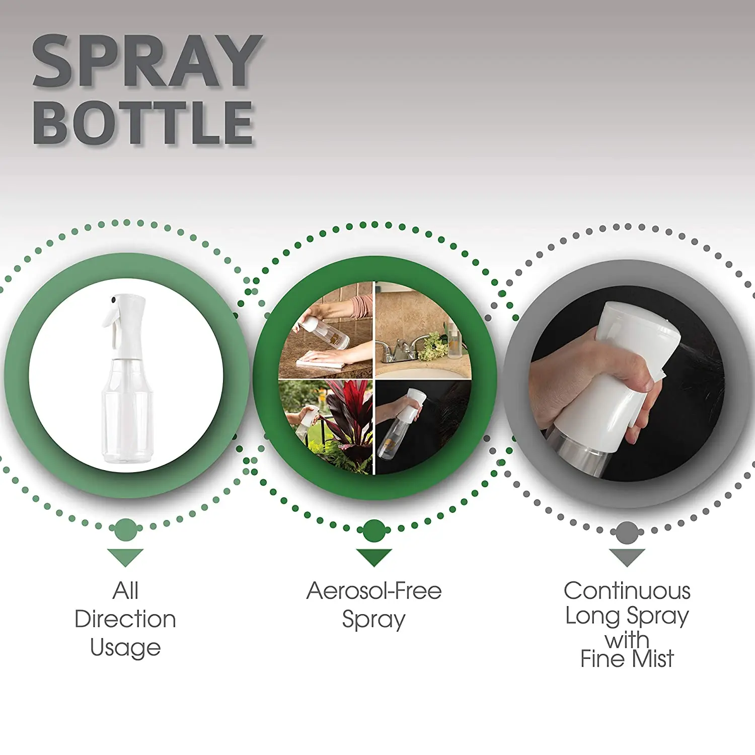Эргономичный дизайн: стандартные триггерные бутылки принимают несколько сдавливания, чтобы начать распыление, но 360 бутылка для спрея для волос выпускает бюст тонкой и долговечной с просто нежным сдавливанием. Эргономичная форма и удобная ручка уменьшает усталость рук.