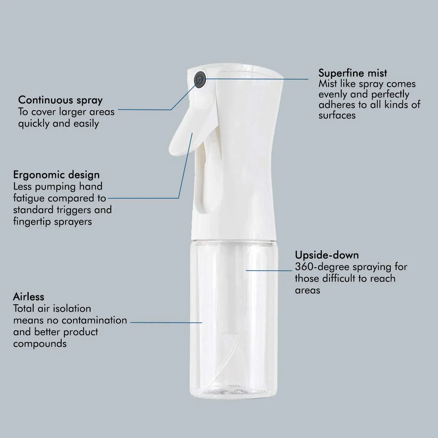 360-градусное распыление: Непрерывная распылительная бутылка позволяет 360 градусов распыления для тех районов, которые трудно достичь. Вы даже можете использовать его в сторону и вверх ногами. Распылительная бутылка обеспечивает 98% воды эвакуации, так что вы можете использовать даже последнюю каплю жидкости.