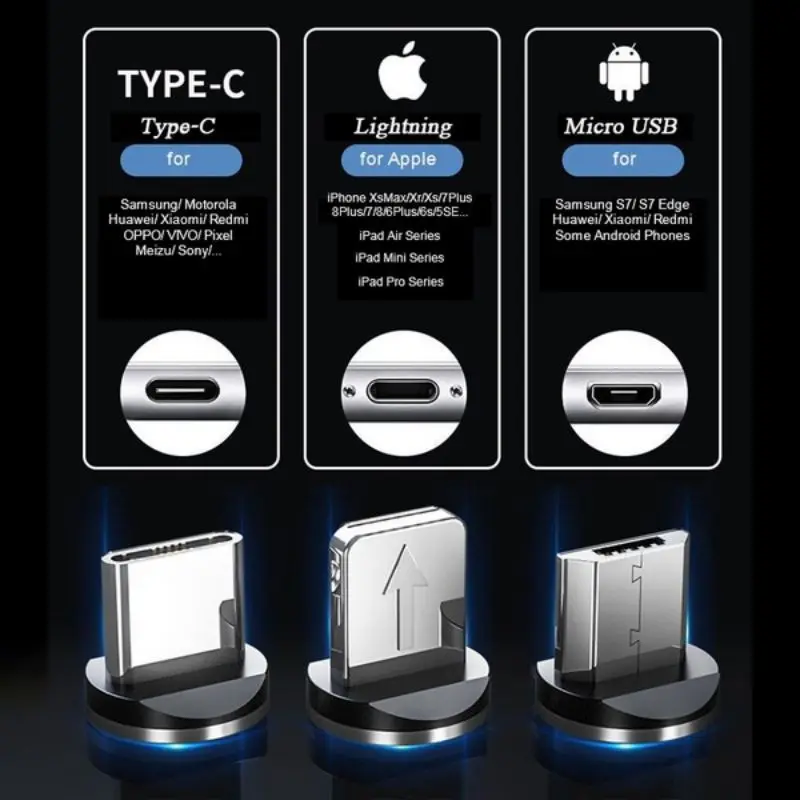 Название продукта: Магнитный зарядный кабель 360 ° ● Магнитный дизайн позволит вам испытать лучший способ зарядки вашего телефона ● Светодиодный индикатор, когда кабель находится в состоянии зарядки, встроенный СВЕТОДИОДНЫЙ индикатор загорается и дверь автомобиля закрыта. ● Применимые модели: Android / Apple / Type-C ● Характеристики продукта: не жарко, быстрая зарядка ● Размер изделия: 1 метр Доступные цвета: такие же, как на фотографиях ● Материал изделия: алюминиевый сплав, ТПЭ, медный сердечник, светодиодный светильник ● Ток продукта: 2A