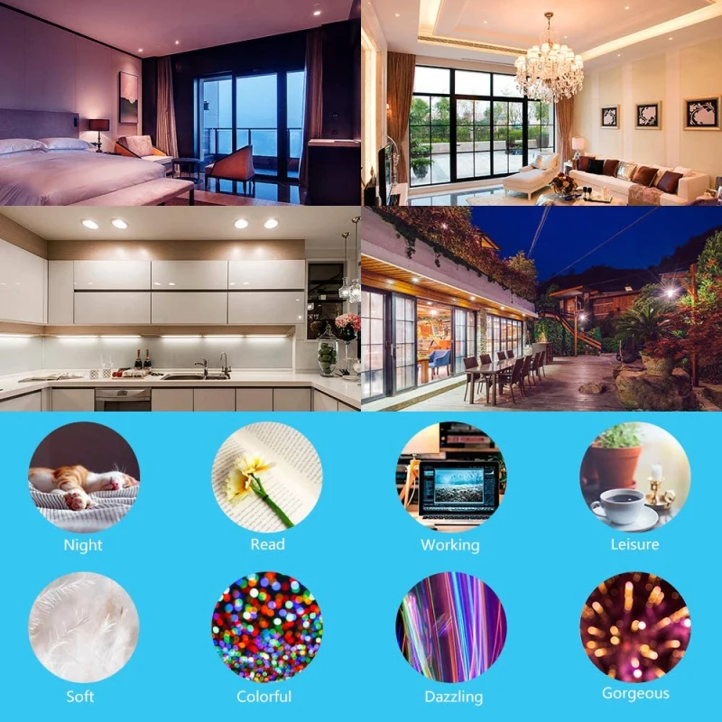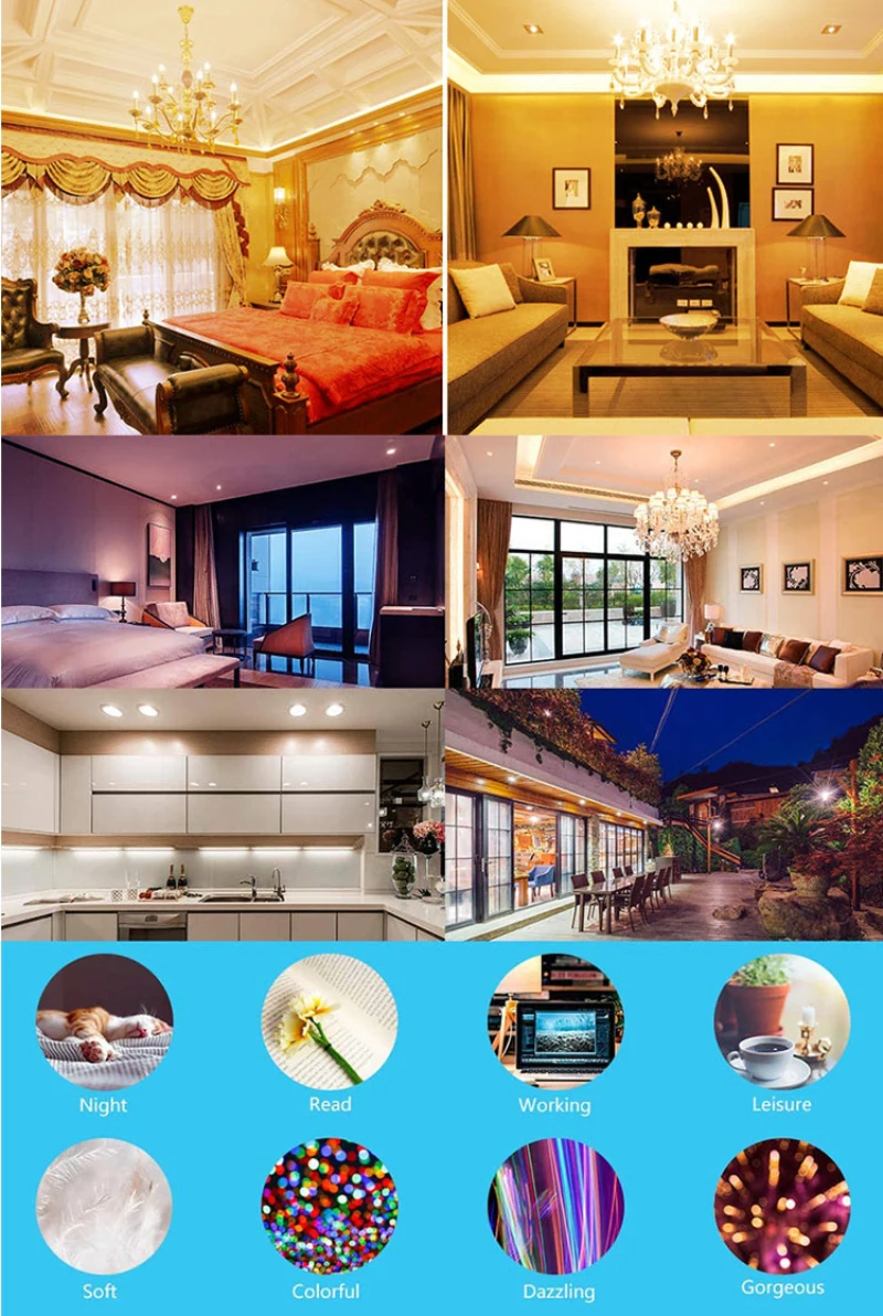 Экономия энергии и Многофункциональность: сверхнизкое энергопотребление и Экономия более 60% энергии по сравнению с обычными лампами. Лампочка может использоваться в любом месте, где вам нужен красочный светильник с умным управлением. Такие как дом, гостиница, конференц-зал, рестораны, бар, кафе, праздник.