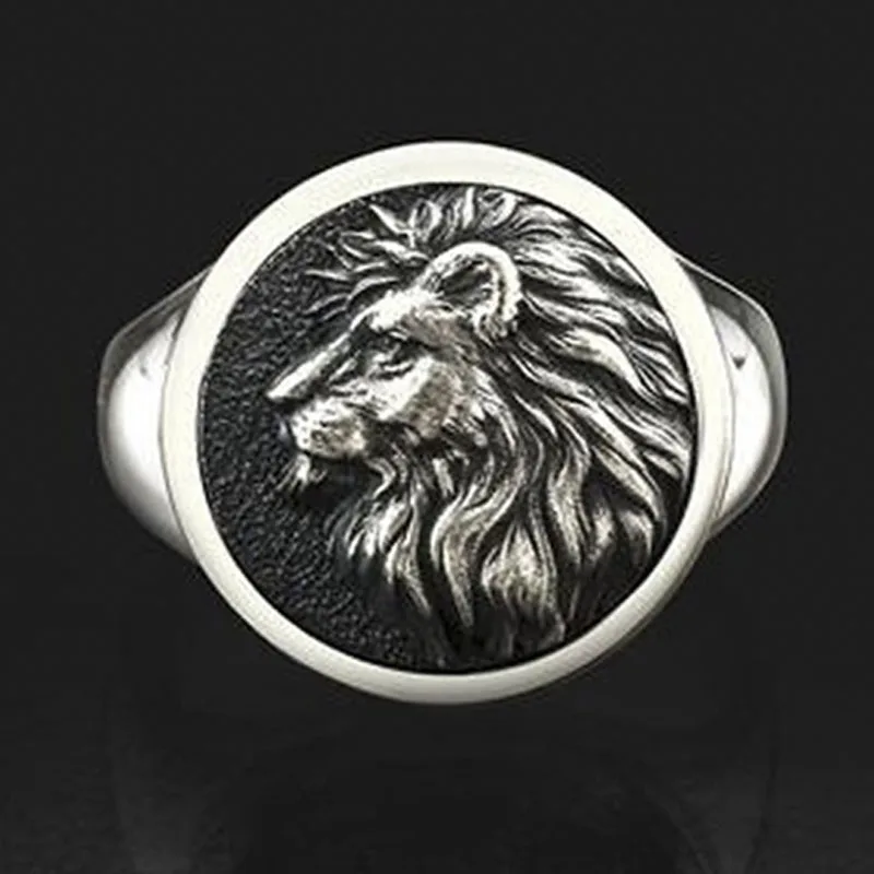 Кольцо мужское, серебристое, круглое, в виде головы короля льва