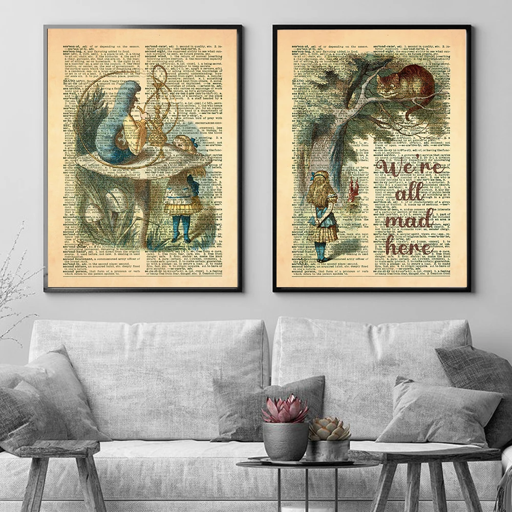 Настенный Ретро плакат Алиса в стране чудес, винтажная живопись на холсте в словаре, постеры и печать для домашнего декора гостиной