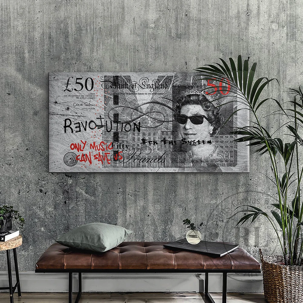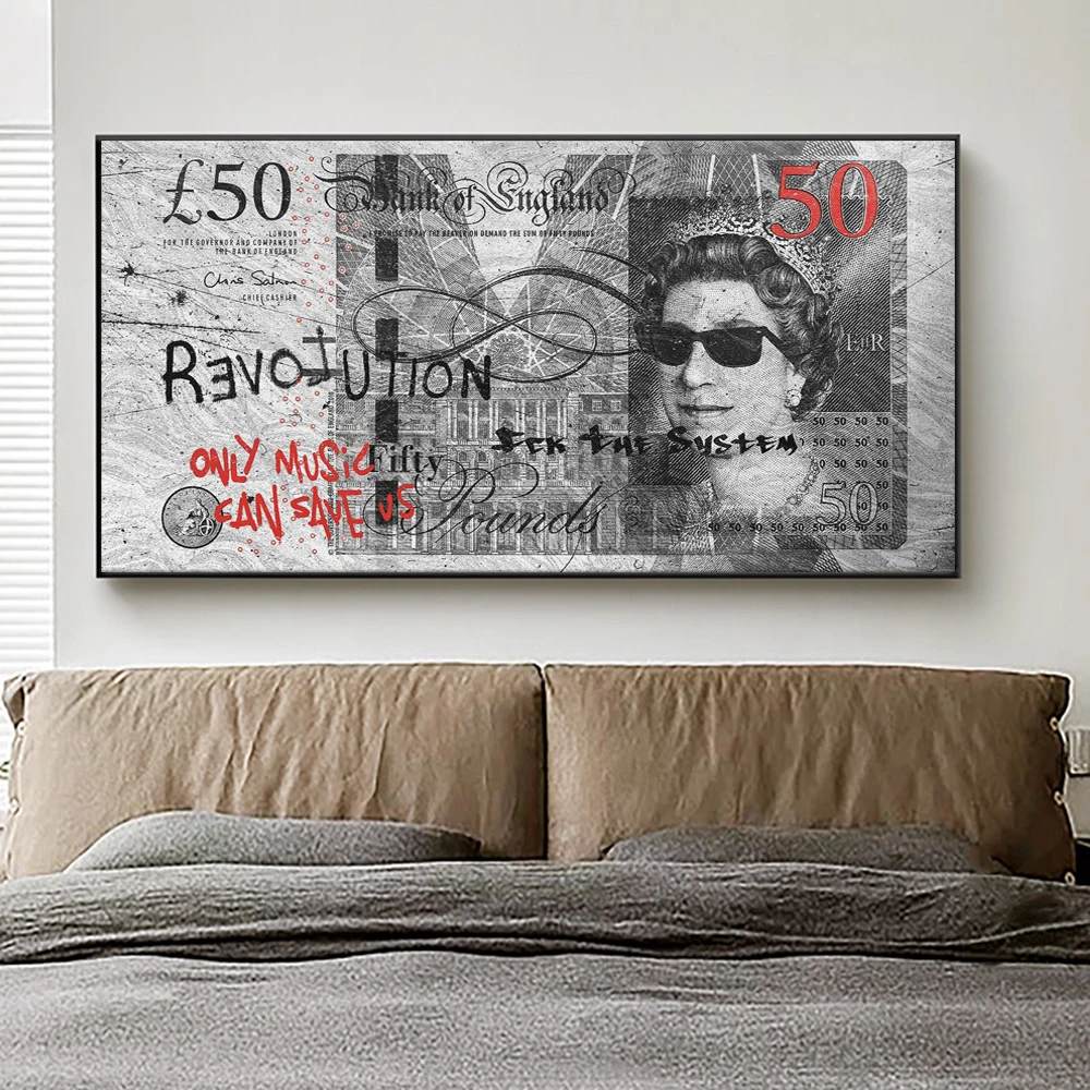 Граффити, деньги, холст, искусство, 50 фунтов, искусство, холст, печать на стене, королева Англии, живопись для декора гостиной