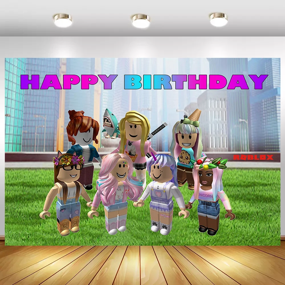 Виниловый фон для фотосъемки с изображением пастбища и офисных зданий для девочек Roblox фон для фотосъемки на день рождения