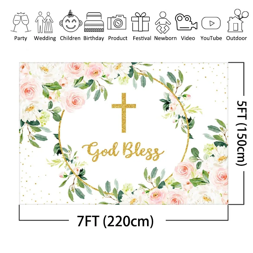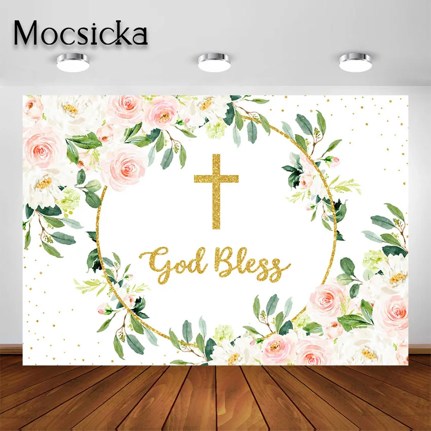Фон Mocsicka с изображением богов, цветов, Креста, украшения для первого Святой вечерние, зеленых листьев, для девочек, для крещения, Причастия