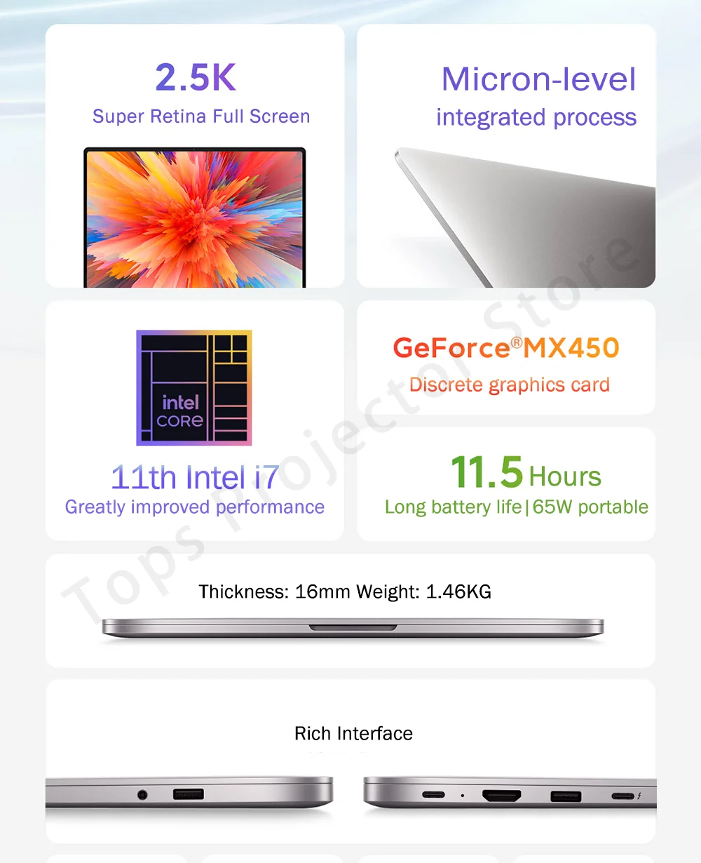 14 "Супер Retina полный экран *Разрешение 2560 × 16004,3 мм узкая рамка, 88.2% соотношение экрана к корпусу16:10 соотношение дисплея, жесткий экран высокой четкости с антибликовым покрытием, угол обзора 178 °,Яркость 300 нит (типичное значение), коэффициент контрастности 1000:1 (типичное значение),100% цветовая гамма sRGB (типичное значение), поддержка затемнения постоянного тока,Прошел сертификацию TüV Rheinland низкий синий светильник