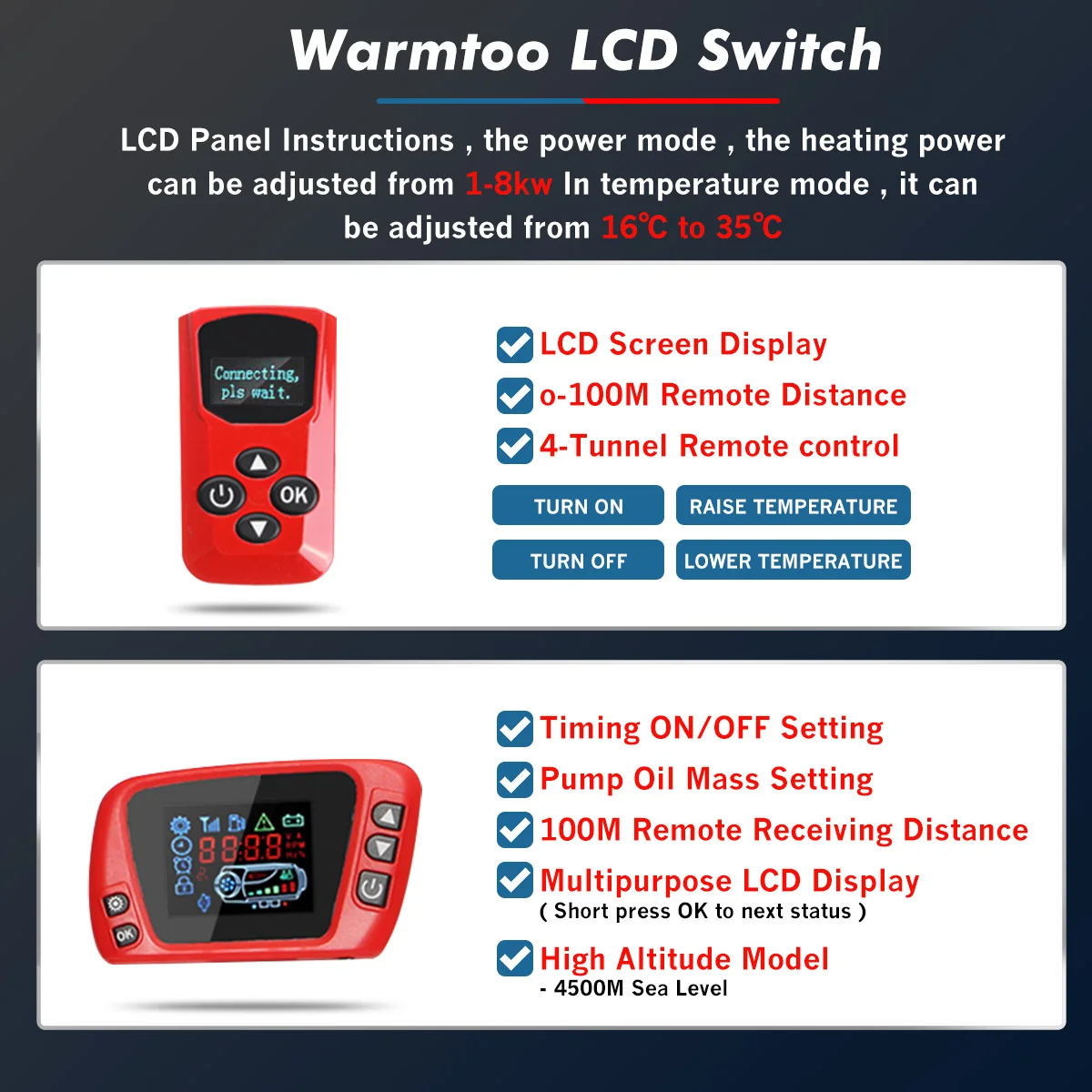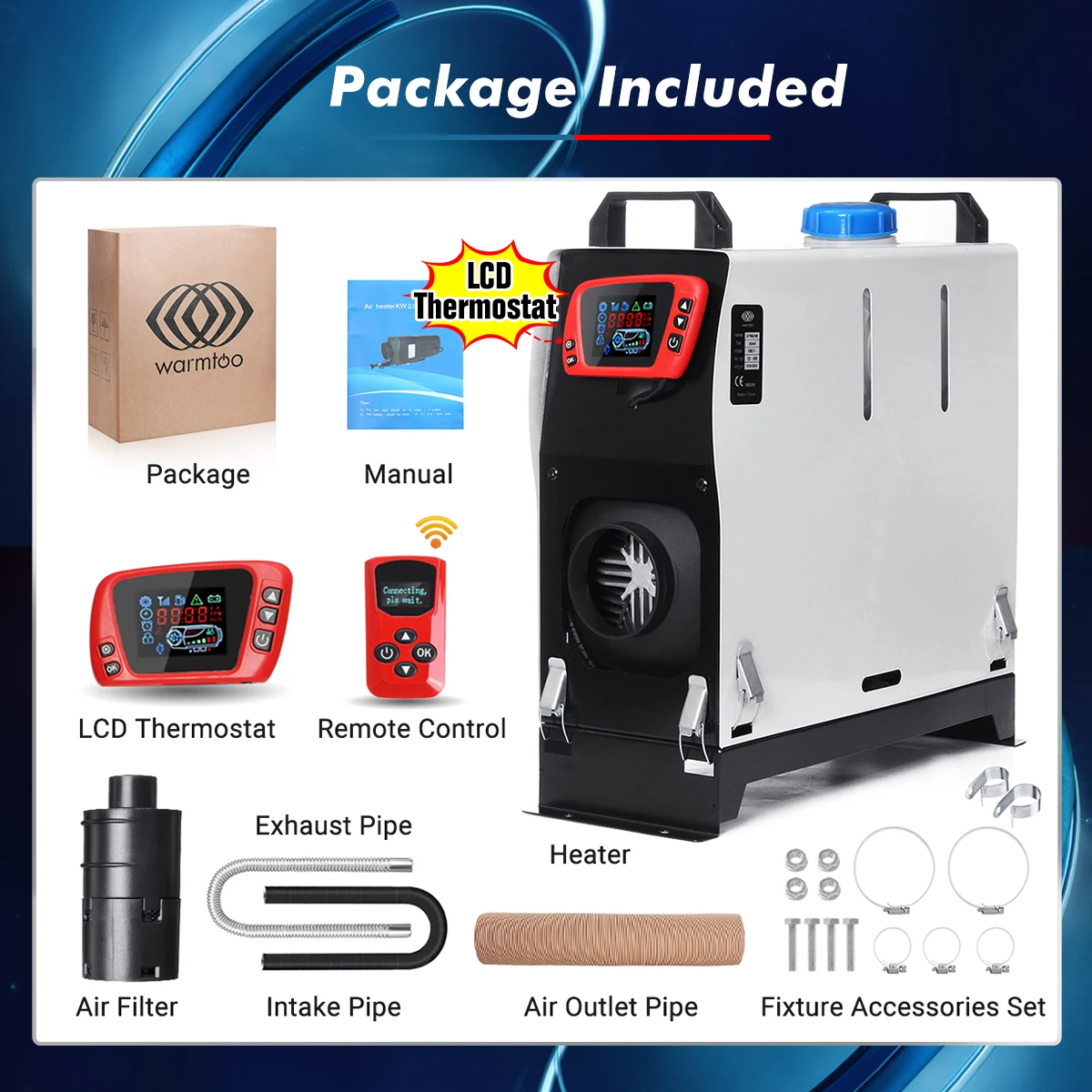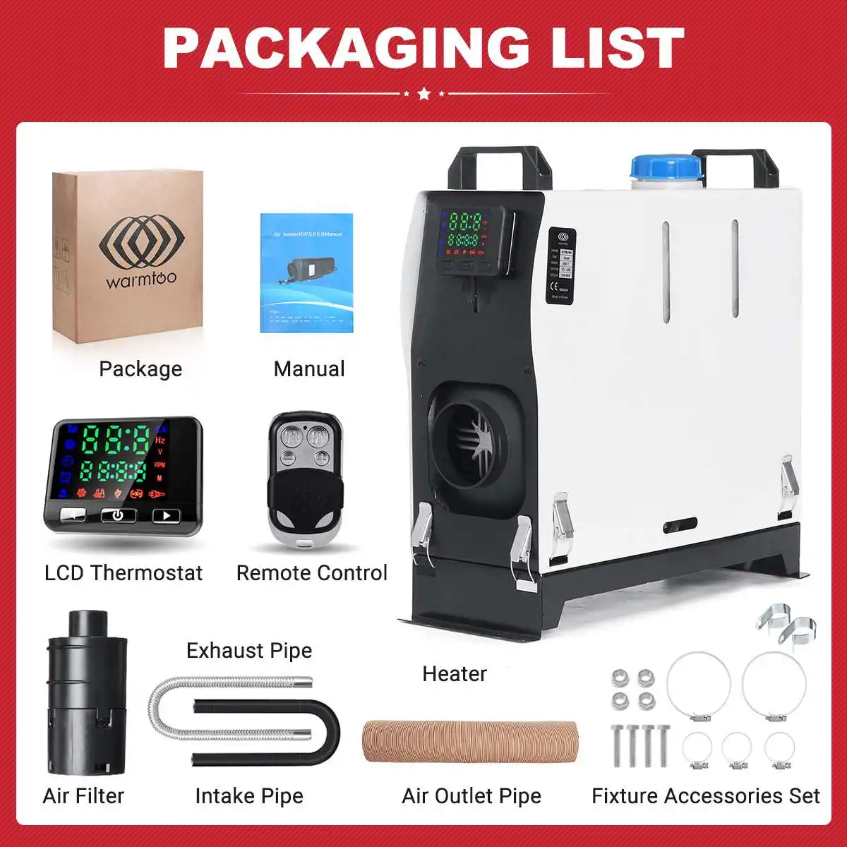 Посылка в комплекте1 x парковочный обогреватель (ЖК-термостат)1 x пульт дистанционного управления (батарейки в комплект не входят)1 х воздуховодная труба1 х впускная труба1 х выхлопная трубаНабор аксессуаров для крепления-1 шт.