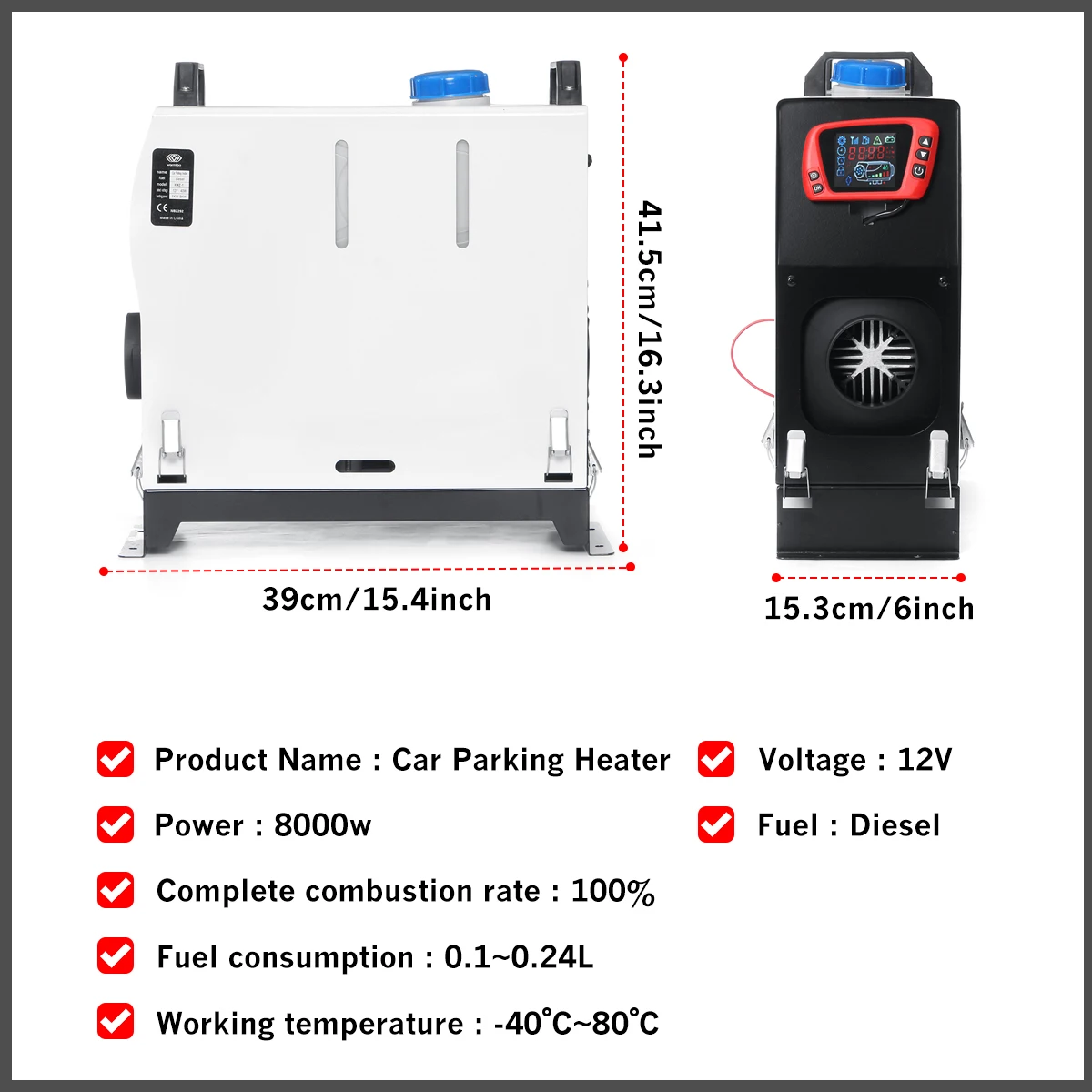Все в одном 12V 8 кВт Дизельный подогреватель воздуха автомобиля стояночный отопительТехнические характеристикиМатериал: металл + пластикЦвет: черный; Черный + белыйРазмеры: 15,3 × 39 × 41,5 см (6 × 15,4 × 16,3 ")Напряжение: 12 ВМощность: 8000 ВтТопливо: ДизельПолный коэффициент сгорания: 100%Расход топлива: 0,1 ~ 0,24 лРабочая температура: -40 °C ~ 80 °C