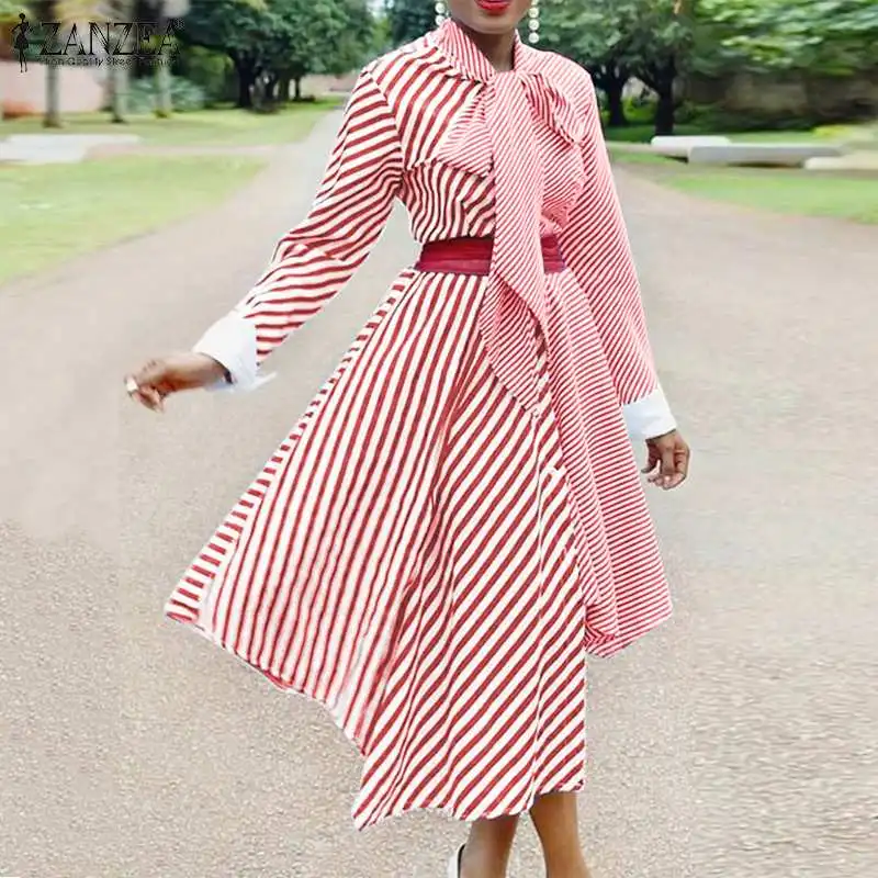 Платье-рубашка ZANZEA женское в полоску, модный Асимметричный Сарафан средней длины с длинным рукавом и бантом, в стиле пэчворк, осень