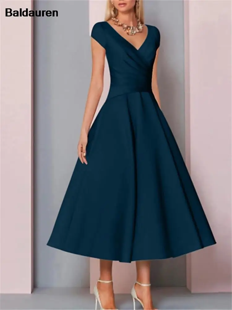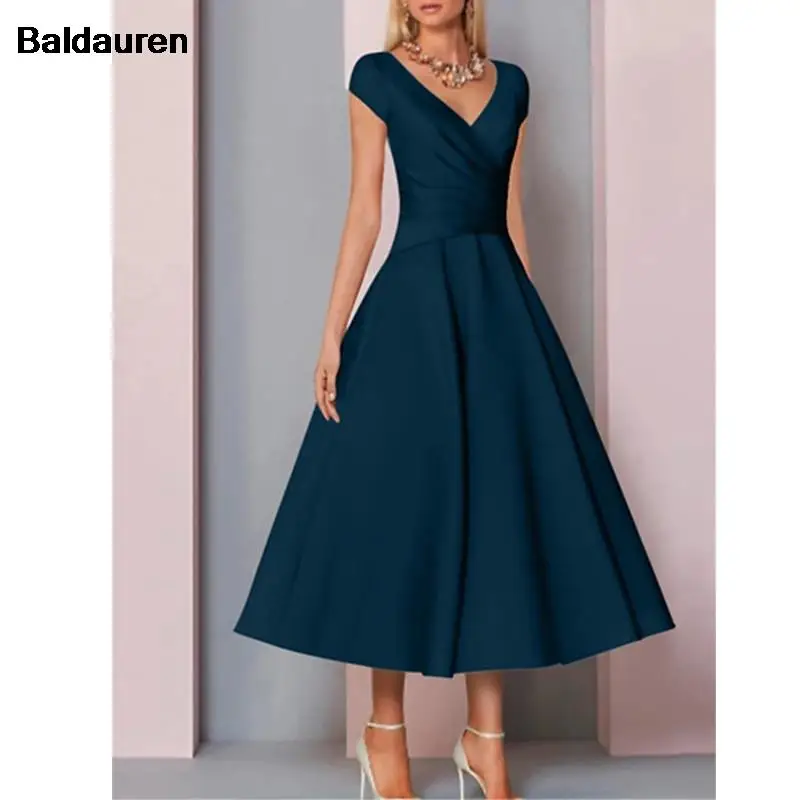Элегантные платья для матери невесты 2021 длиной до середины икры шармёз темно-синее вечернее платье для матери без рукавов с рюшами