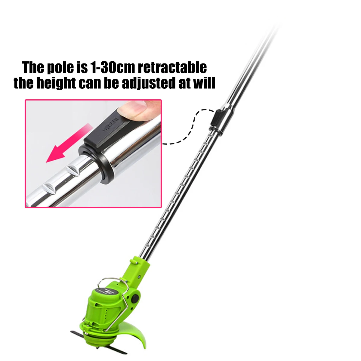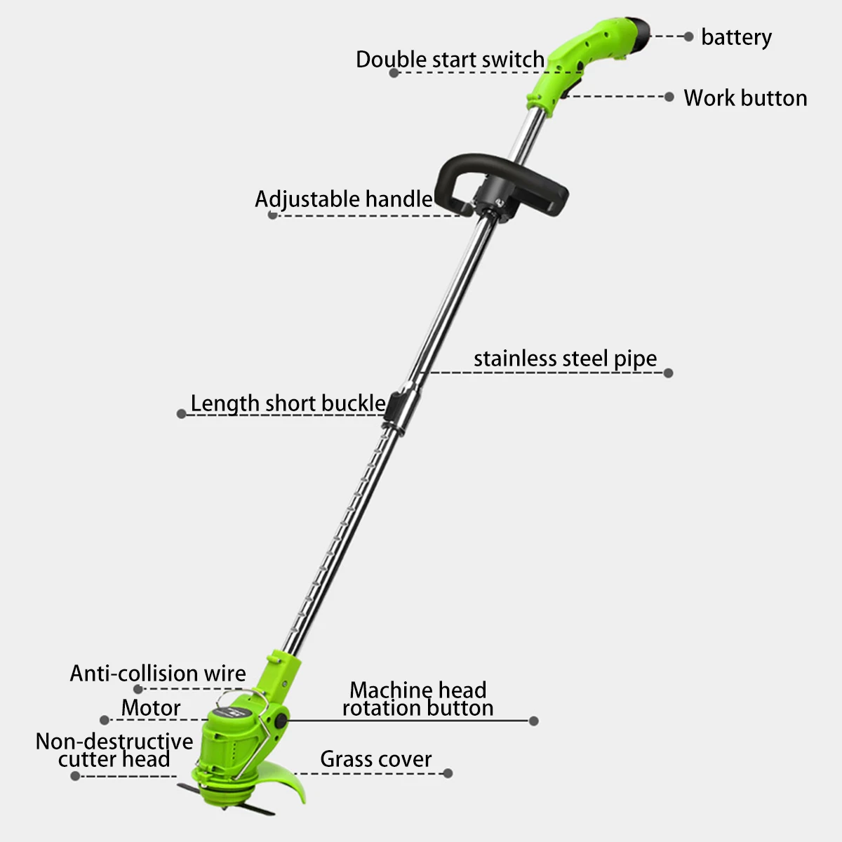Особенности и преимущества:● Попрощайтесь с традиционным способом коровки, экономя время и усилия● Подходит для всех видов домашней лужайки● Не нужно подключать плату, портативный и легкий● Перезаряжаемая литиевая батарея, может использоваться непрерывно по беспроводной сети после полной зарядки● Высоту телескопического стержня можно регулировать● Угол головы можно регулировать, а угол головы можно выбрать в соответствии с окружающей средой засорения● Двойной переключатель управления, чтобы предотвратить несчастные случаи, кнопка и гаечный ключ могут быть нажаты одновременно, чтобы начать работу газонокосилки