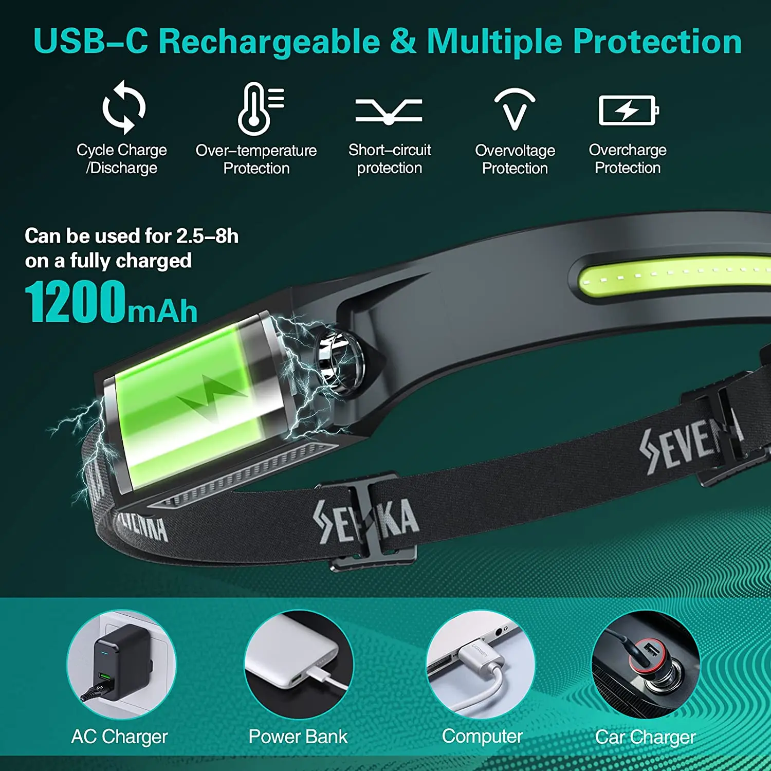 【 5 режимов освещения и яркий длинный свет 】этот COB налобный фонарь прост в использовании, короткое нажатие кнопки для переключения через COB High/ COB Low/ XPE High/ XPE Low режимы/OFF. Длительное нажатие в течение 2 с для включения режима стробоскопа при включении светильник. Встроенный аккумулятор емкостью 1200 мАч. Время зарядки: 2 ч полностью заряжен. Время работы: 2,5-8 часов после того, как полностью заряжен. Примечание: Время работы отличается в зависимости от режима освещения.)