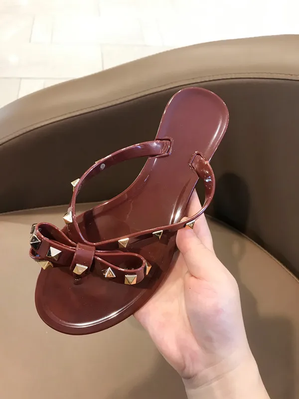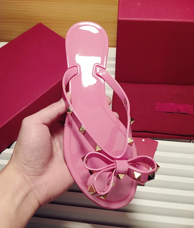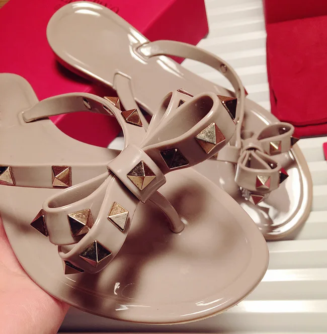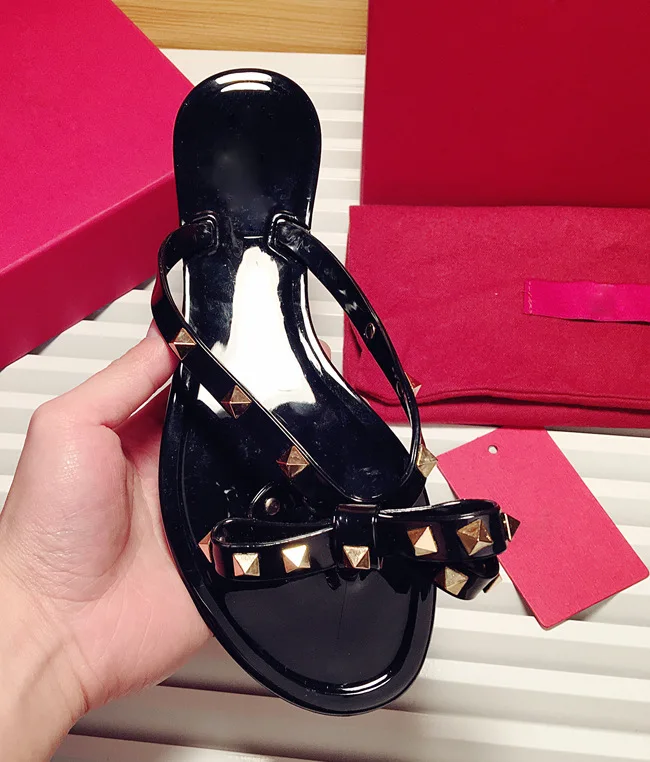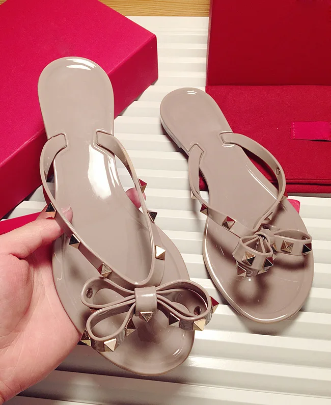 Женские пляжные шлепанцы с заклепками, брендовые сандалии-желе на плоской подошве с большим бантом, Размеры 35-41, для лета, 2021